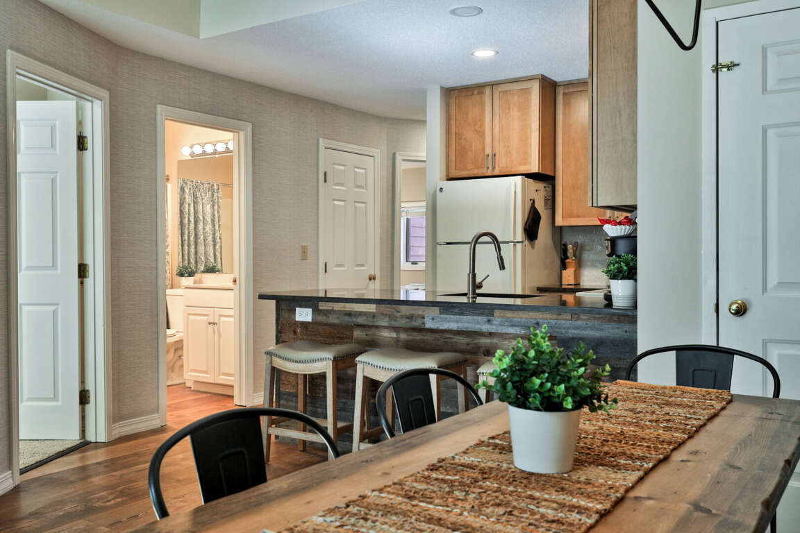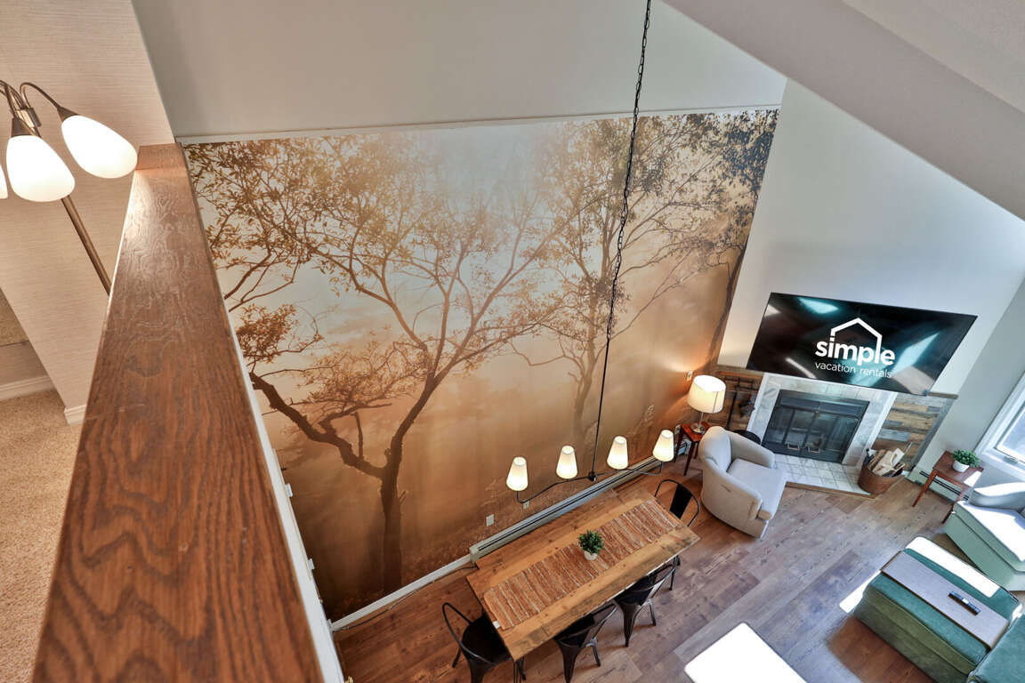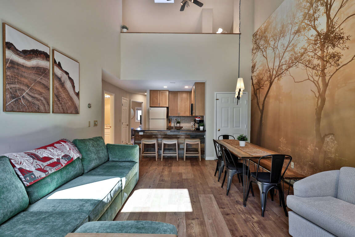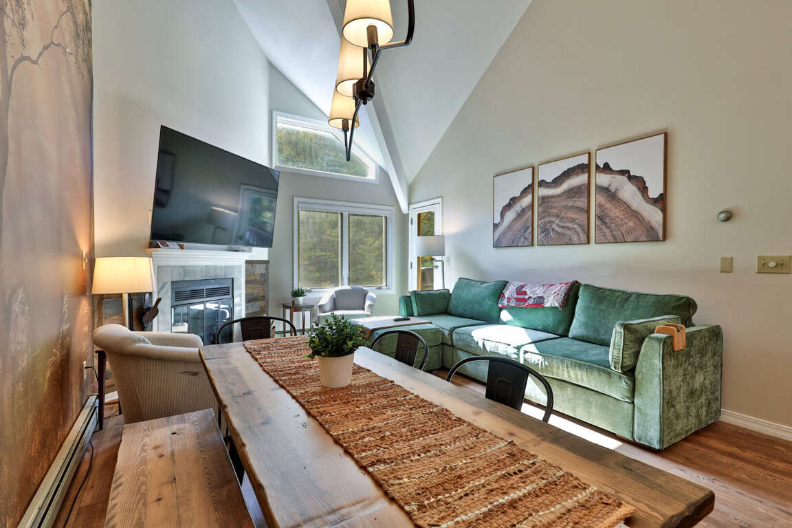 <p>With soaring <strong>cathedral ceilings</strong> and mountain lodge charm, the living room features a massive marble wood-burning <strong>fireplace</strong>, <strong>plush seating</strong>, and a <strong>75” smart TV</strong>, perfect for winding down after a day on the mountain. The <strong>fully renovated kitchen</strong> boasts granite countertops, and everything you need to cook, dine, and entertain. The adjacent <strong>dining area</strong> comfortably seats 8, plus 3 more at the <strong>breakfast bar</strong>.</p>