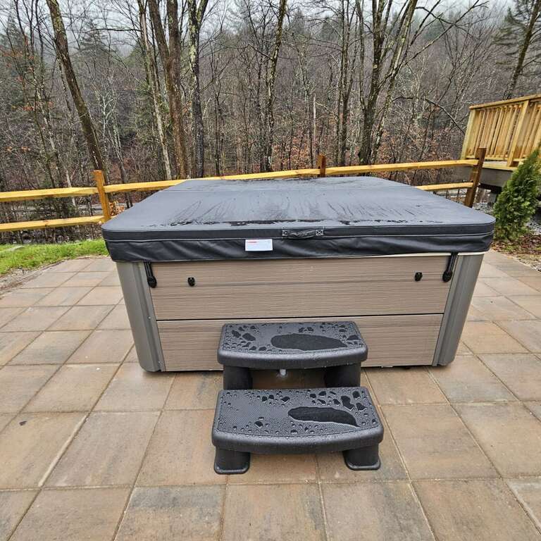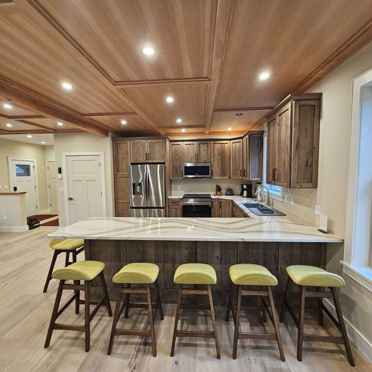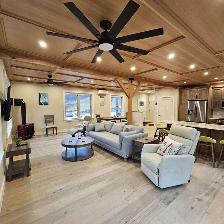 <p>The <strong>private six-person hot tub</strong> sits on a dedicated <strong>patio</strong> and is professionally maintained for your arrival—perfect for après-ski relaxation. Inside, the <strong>Great Room</strong> features coffered ceilings and a red enamel gas stove that warms the whole space. The <strong>kitchen</strong> has quartz counters, stainless appliances, and sharp knives because we know you want to cook real meals here.</p>
