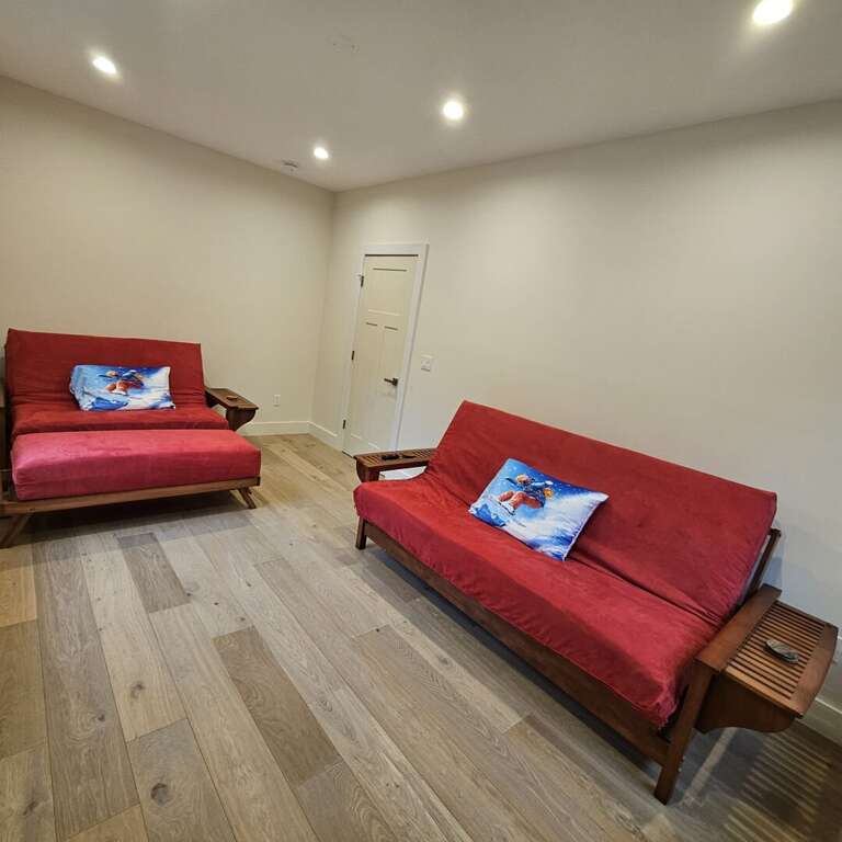 <p>The layout handles <strong>two families or mixed groups</strong> easily. Adults can choose between the <strong>Queen bedroom</strong> or the <strong>Full bedroom</strong>, both featuring hardwood floors. Kids get their own zone in the <strong>bunk room</strong> (Twin-over-Full with stairs) or the<strong> flex room</strong> with convertible futons and a TV. Blackout shades and premium mattresses ensure everyone sleeps comfortably.</p>