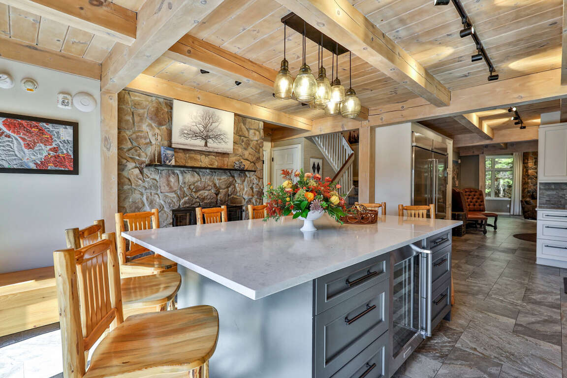 <p>The <strong>chef’s kitchen</strong> is a culinary masterpiece with Viking Commercial appliances, granite countertops, and custom cabinetry. The double-sided wood-burning <strong>fireplace </strong>connects the kitchen, dining, and living areas, creating an inviting space for gatherings. After dinner, relax in the executive video room, featuring a custom<strong> home theater</strong> for the ultimate entertainment experience or play a friendly game of <strong>pool</strong>.</p>