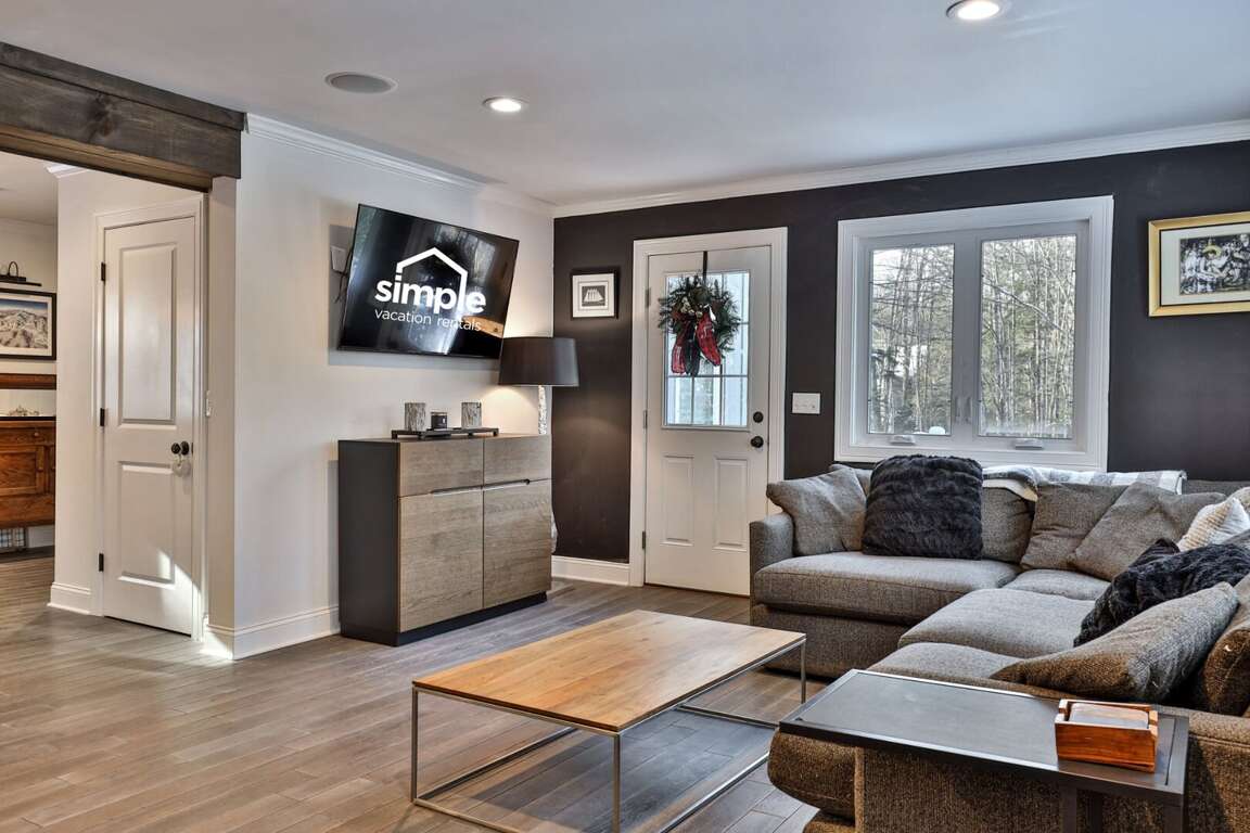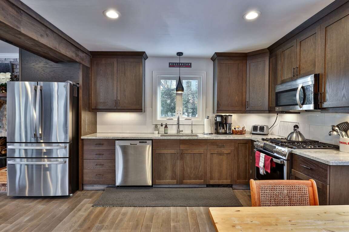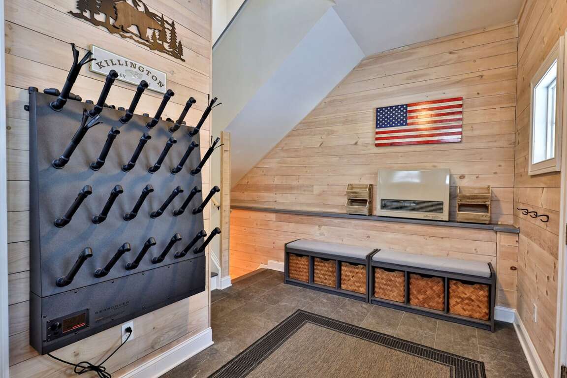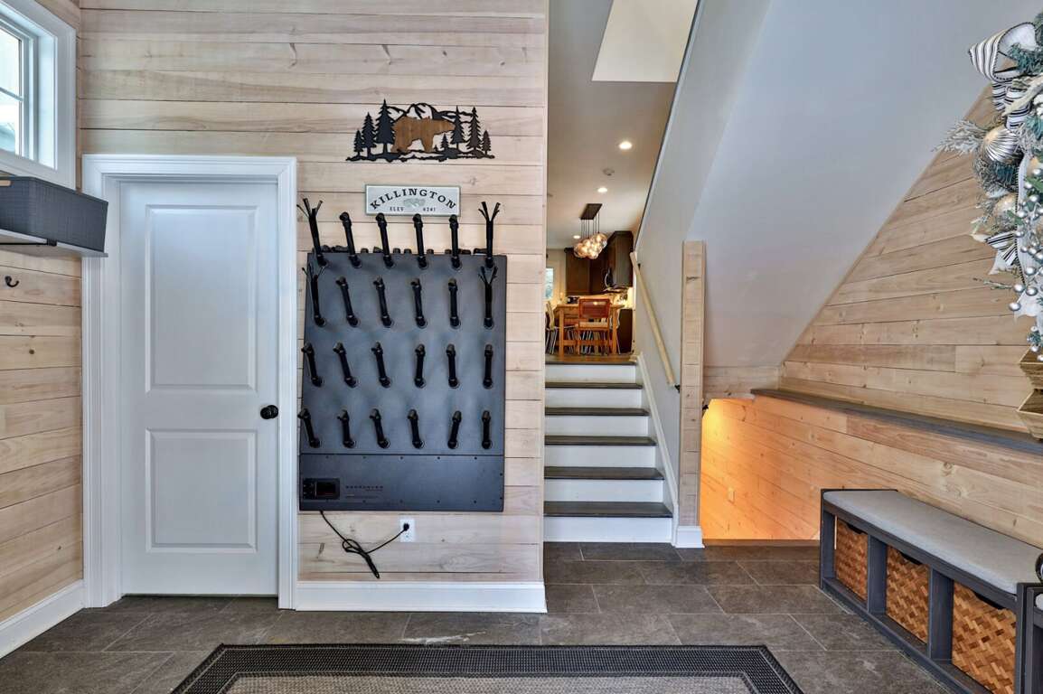 Every detail chosen with the adventure family in mind. You shouldn’t have to settle for a generic condo when you can have a three-story, fully renovated mountain home that works as hard as you do. When you book Summit House on George directly through our local team at Simple Vacation Rentals, you gain exclusive access to preferred ski and snowboard rental discounts with our local partners, as well as limited lift ticket deals. This insider advantage means less time in the rental shop and more time on the mountain. We installed a commercial-grade boot dryer and custom storage cubbies in the dedicated entry mudroom so your gear is always dry and ready for the next session. Because you are positioned just one minute from the Access Road and five minutes from the K-1 Base Lodge, you can skip the morning traffic and hit the slopes before the resort parking lots even fill up. The three-story layout provides the separation families need to truly decompress without feeling crowded. Every bedroom is designed for sleep quality rather than budget, ensuring you wake up ready for another day on the trails. The home sleeps up to 8 guests comfortably. The dedicated upper-level loft serves as a professional outpost with dual mahogany desks and ergonomic seating, situated far enough from the living area to ensure total focus during your remote-work blocks. When the workday ends, prepare group meals in the full kitchen featuring a five-burner gas stove and gather around the massive 8-person dining table designed for family connection. The main level kitchen and natural wood dining table create a central hub for family meals and social time. To ensure total transparency, please note that the wood-burning stove pictured is decorative only and unavailable for guest use. However, the home is fully renovated and climate-controlled for consistent warmth, including heated tile floors in the upstairs primary bathroom for a warm start to cold Vermont mornings. Pets are welcome to join the adventure. Parking for up to four vehicles is provided in the flat, easy-access driveway; there is no guest access to the garage. By booking through Simple Vacation Rentals, you are supported by a Killington-based team that lives here year-round. You have a direct line to real people, not a call center, ensuring professional cleaning standards and 24/7 local support for everything from trail recommendations to maintenance needs. Guests also receive a Curated Local Guide with insider tips on crowds, dining, and lift deals.Renovated 3-Floor Mountain Home with Exclusive Rental Deals and 5-Minute K-1 Access