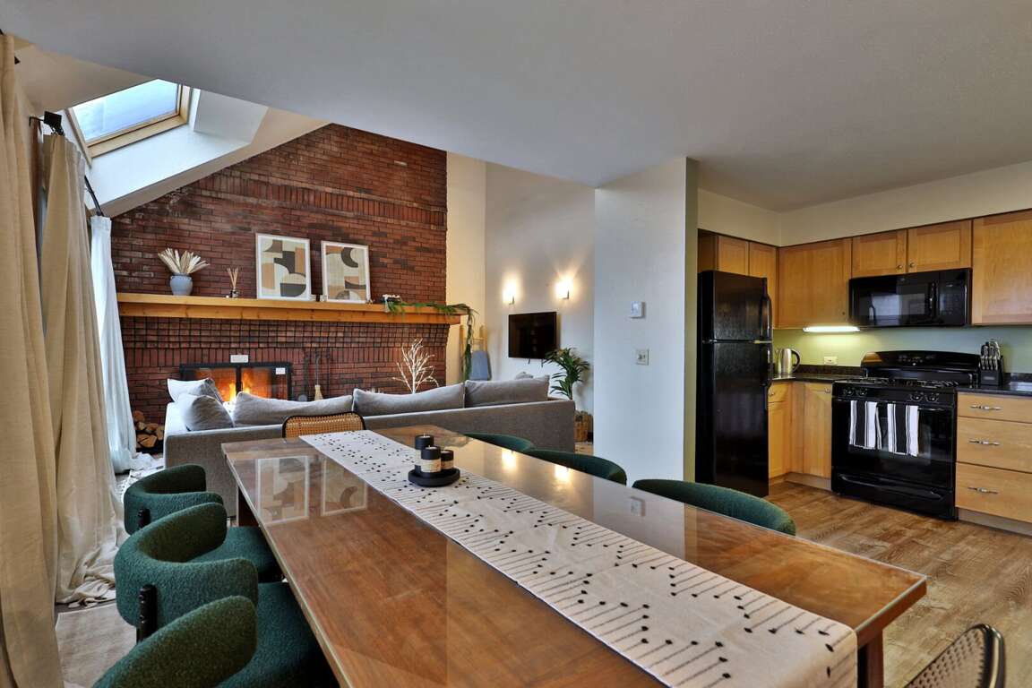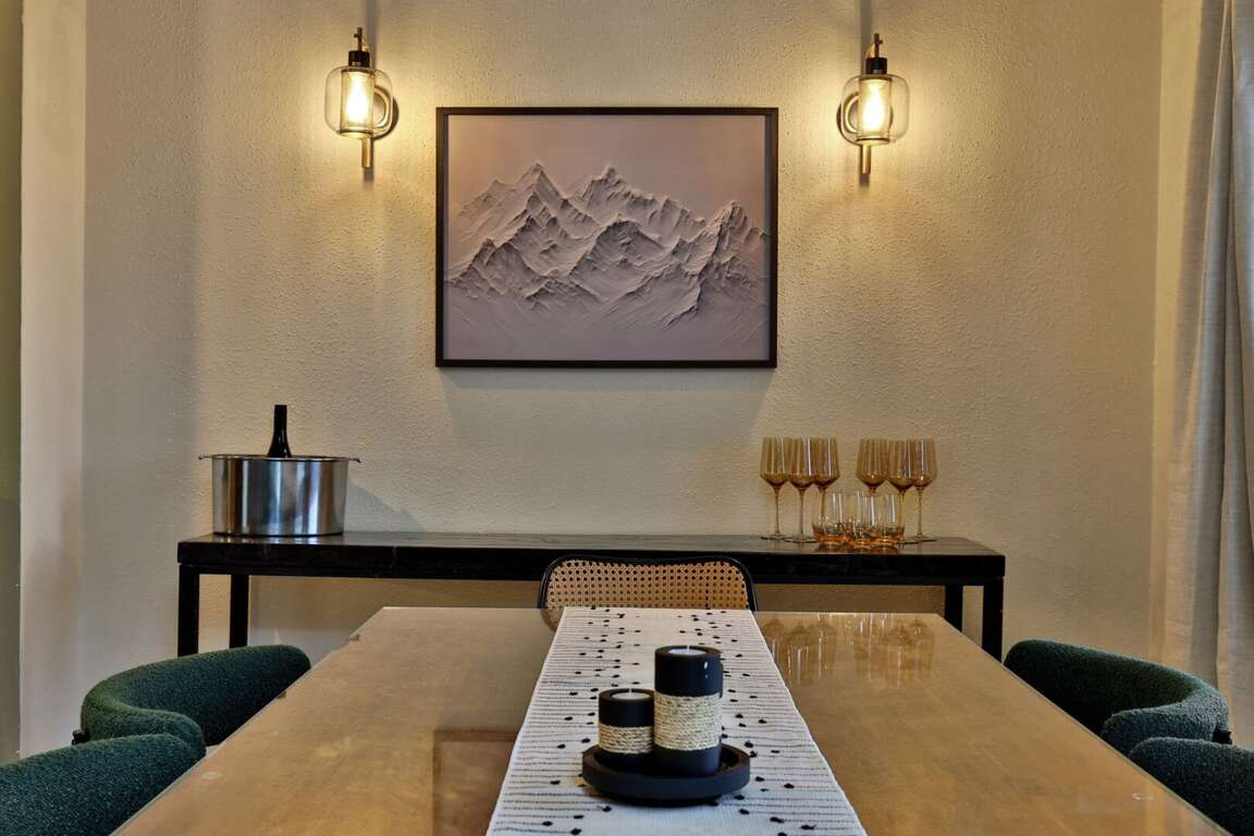 <p>After a day on the slopes, unwind by the <strong>fireplace</strong> in the welcoming <strong>living area</strong> or prepare a hearty meal in the <strong>fully equipped kitchen</strong> with modern appliances. Dine indoors or step onto the <strong>balcony</strong> for a meal with <strong>mountain views</strong>.</p>