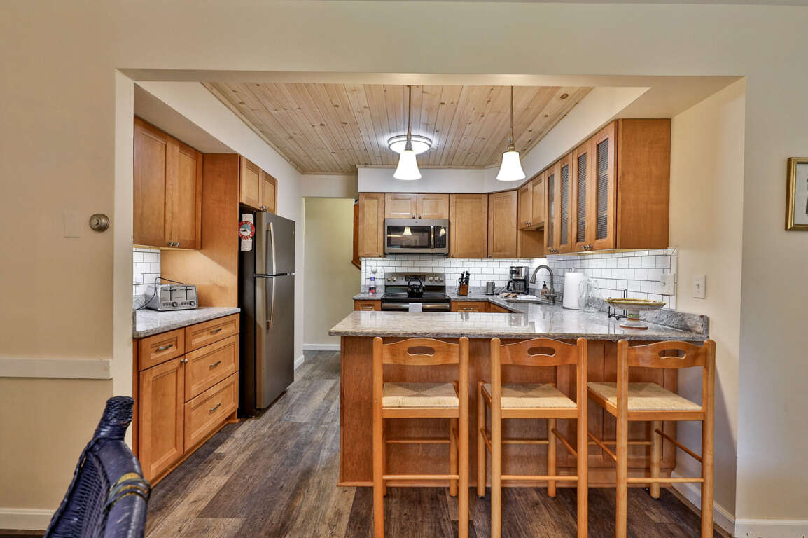 <li>Fully renovated kitchen with stainless appliances, microwave, cookware, and coffee maker.</li>