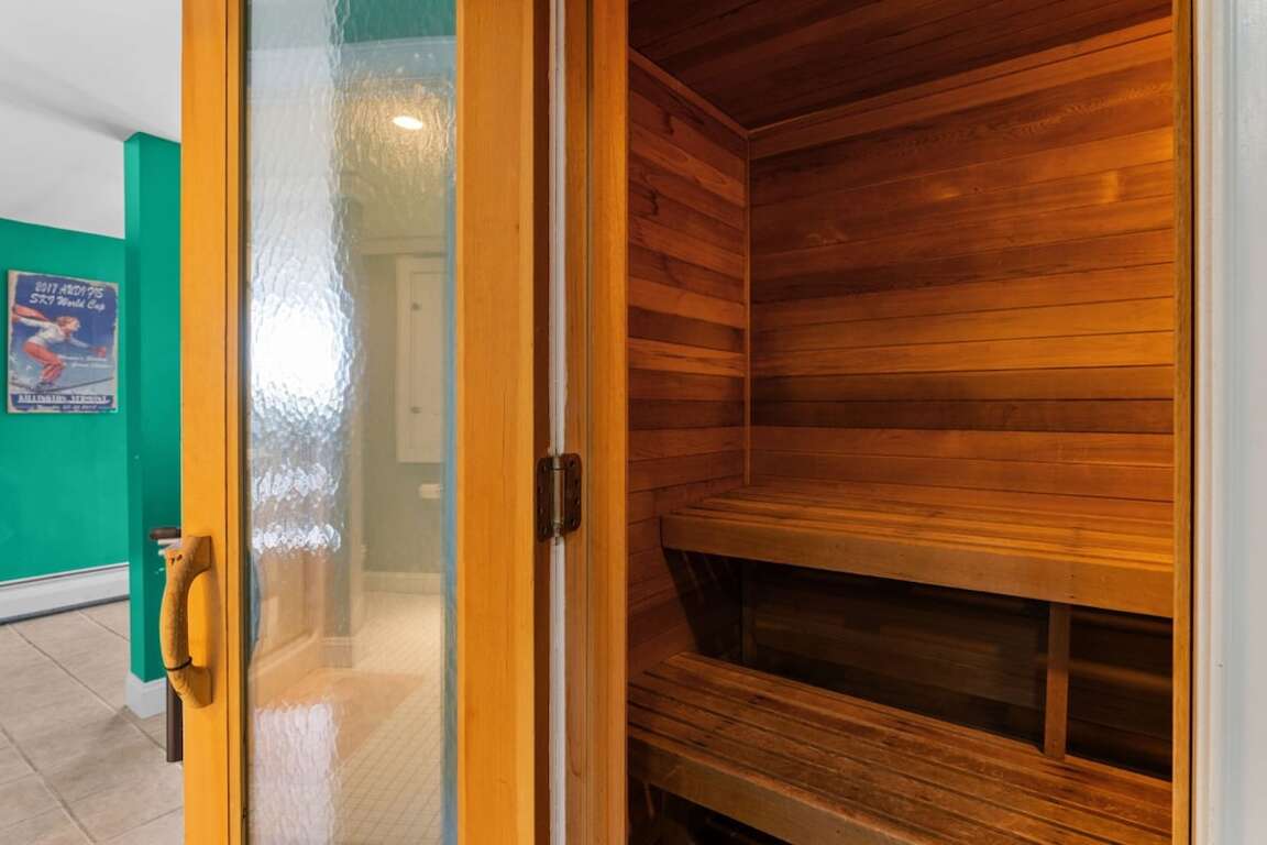 <p>Relax in the <strong>private hot tub</strong> on the deck (snowball range to skiers!) or rejuvenate in the <strong>cedar sauna</strong>. The spacious living area features an oversized wood-burning fireplace (firewood provided), while the game room includes a slate <strong>pool table</strong> and foosball for endless entertainment.</p>