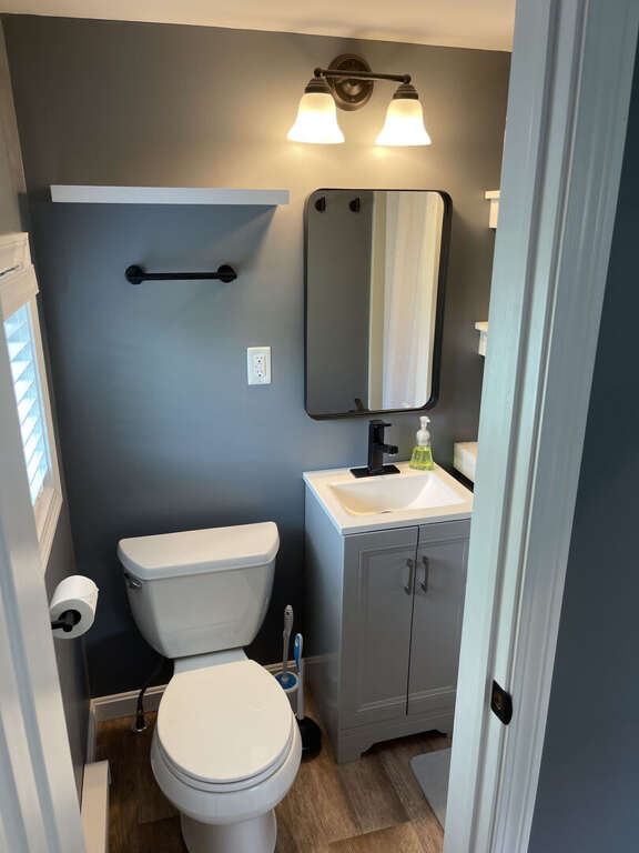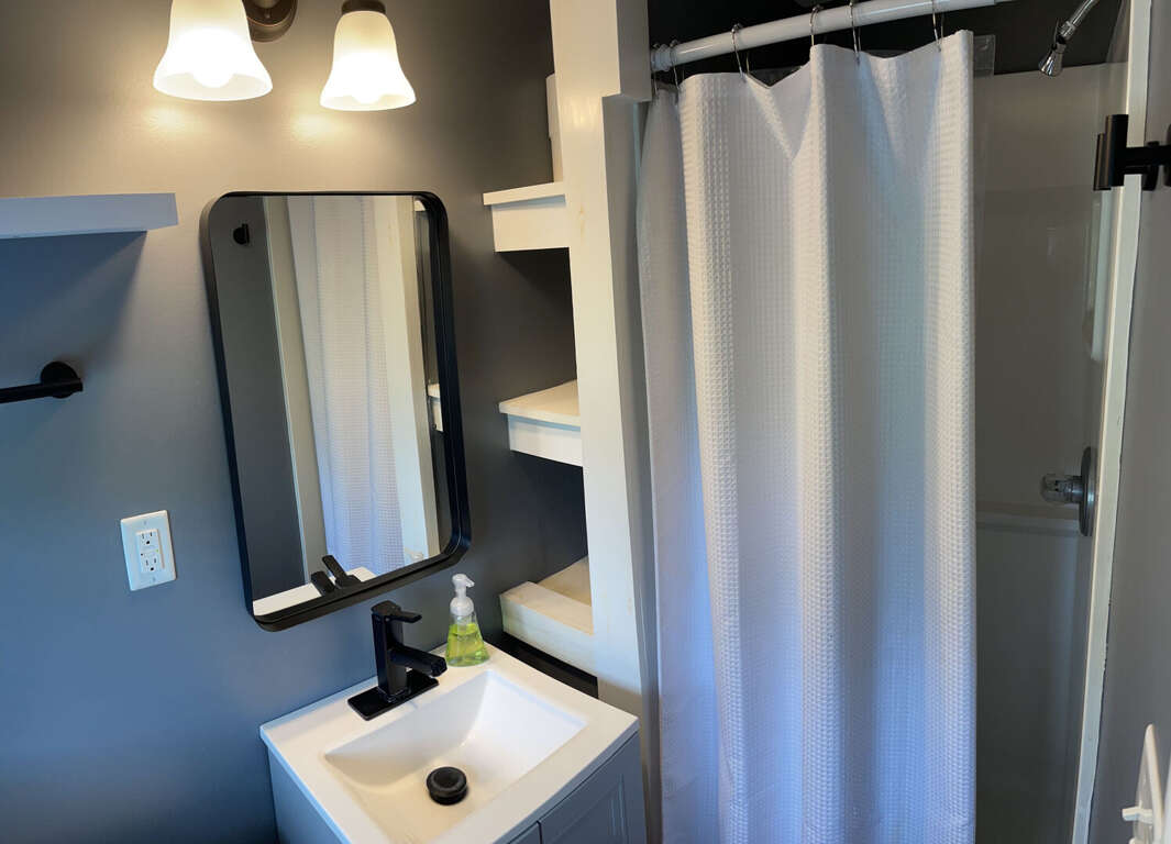 <p>The <strong>bathroom</strong> has a shower only, no tub, plus a toilet and small vanity with storage. <strong>Baseboard heat</strong> keeps the space warm in winter, and a <strong>portable AC</strong> unit helps on warmer days.</p>