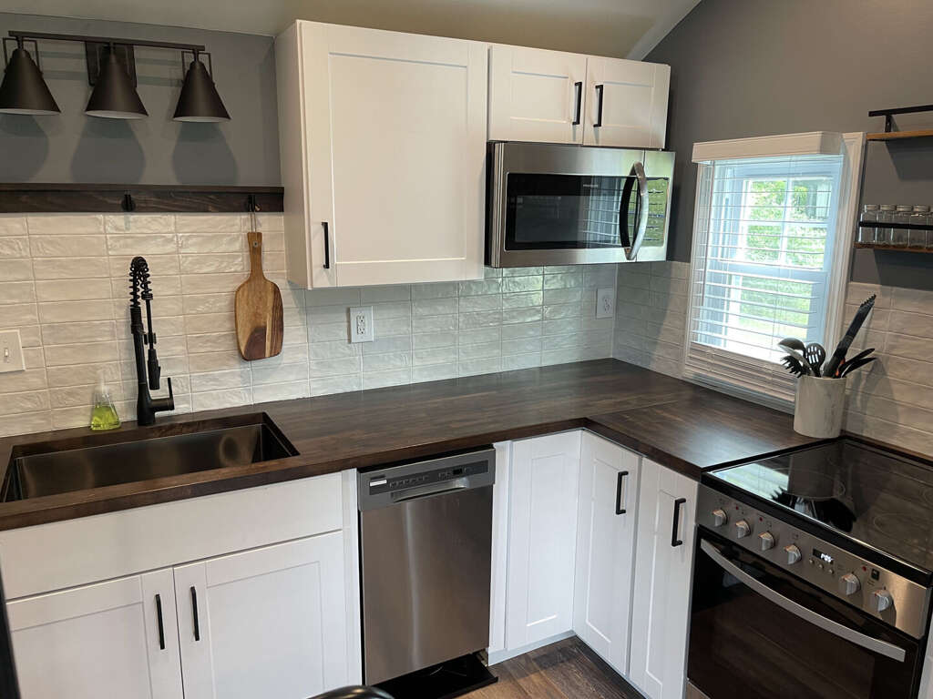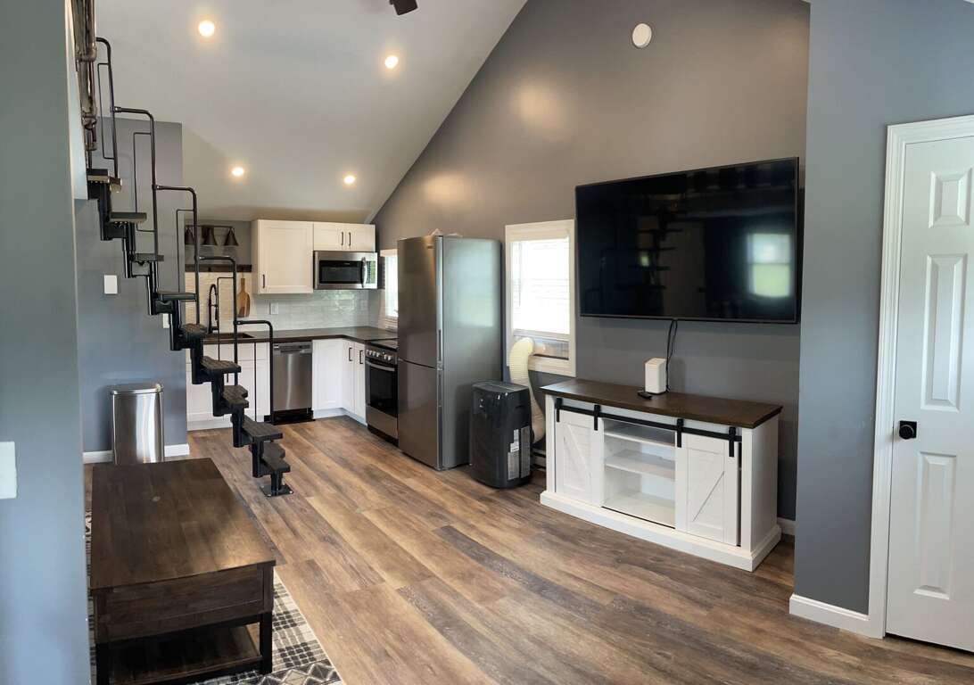 <p>The <strong>main level</strong> of Nest Loft House has a regular sofa, coffee table, and wall mounted smart TV in the living area. The <strong>kitchen</strong> includes a full size refrigerator, electric range and oven, built in microwave, dishwasher, basic cookware and utensils, dishes, and a drip Keurig coffee maker.</p>
