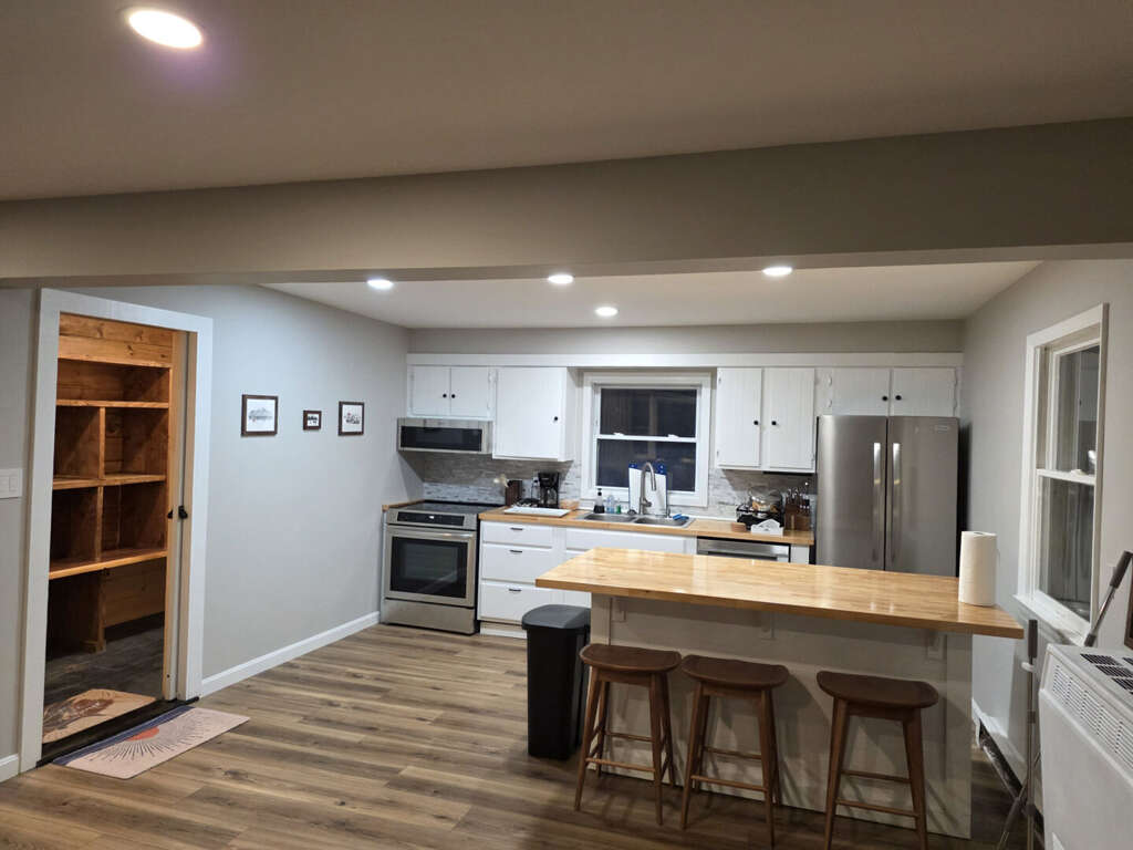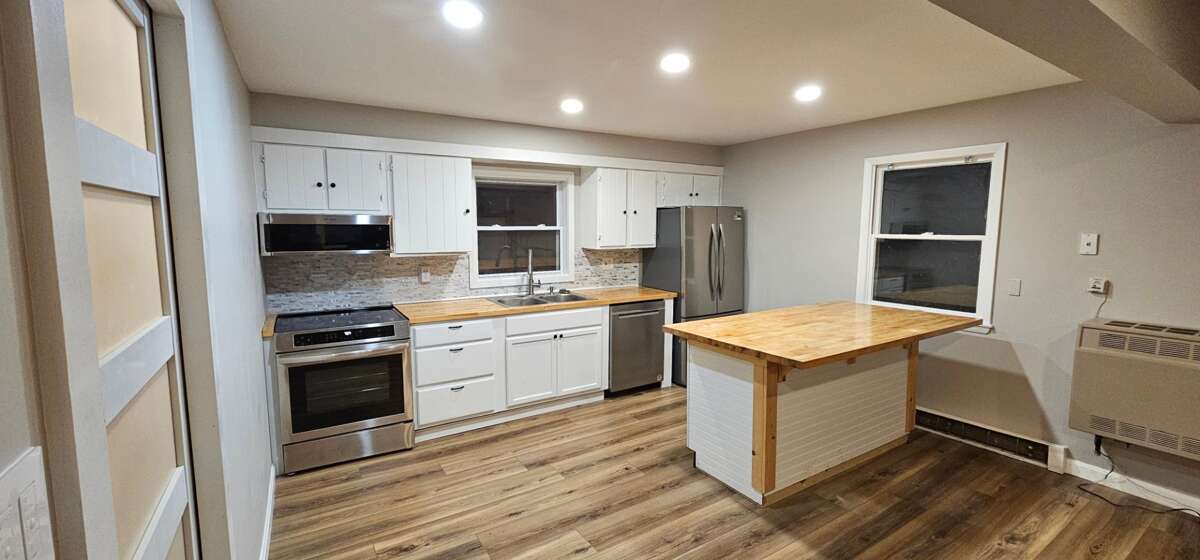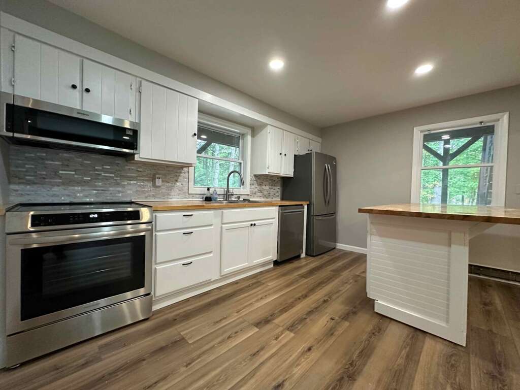 <li><strong>Modern Kitchen:</strong> Renovated with butcher block countertops, stainless steel appliances, and central island.</li>