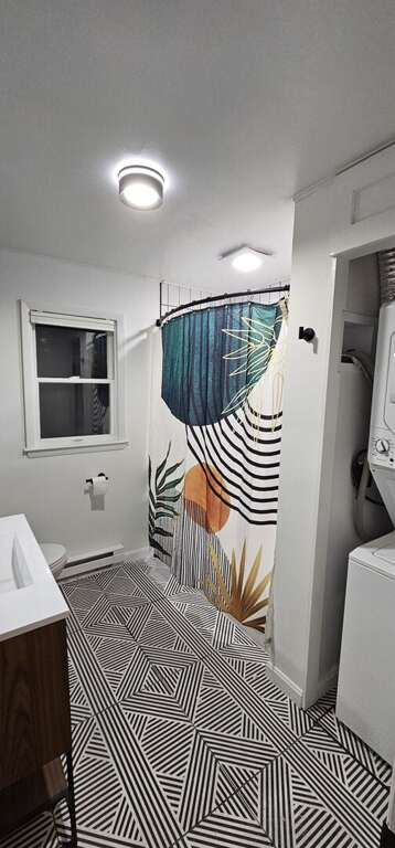 <li><strong>In-Unit Laundry:</strong> Stacked GE washer and dryer in the bathroom.</li>
