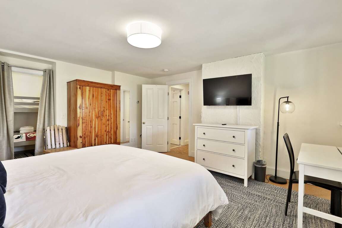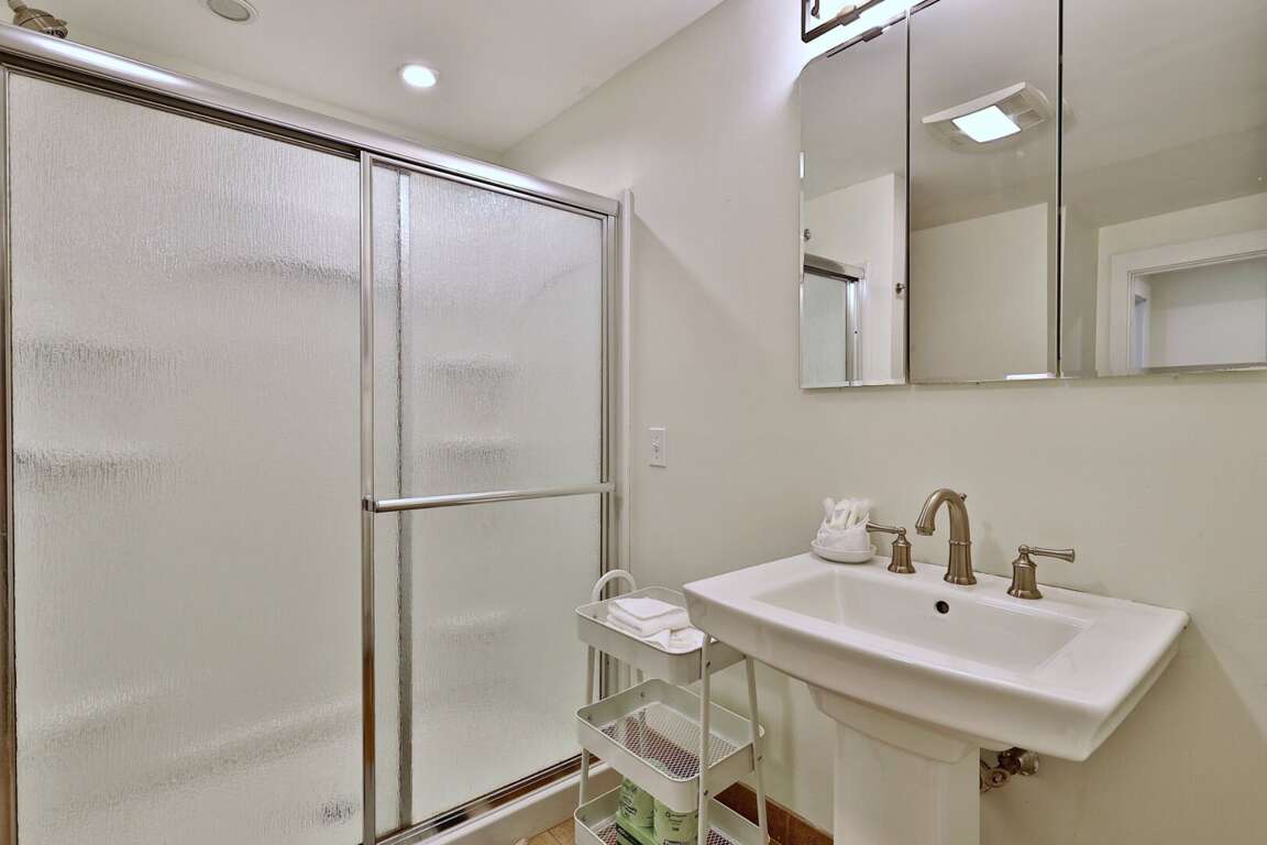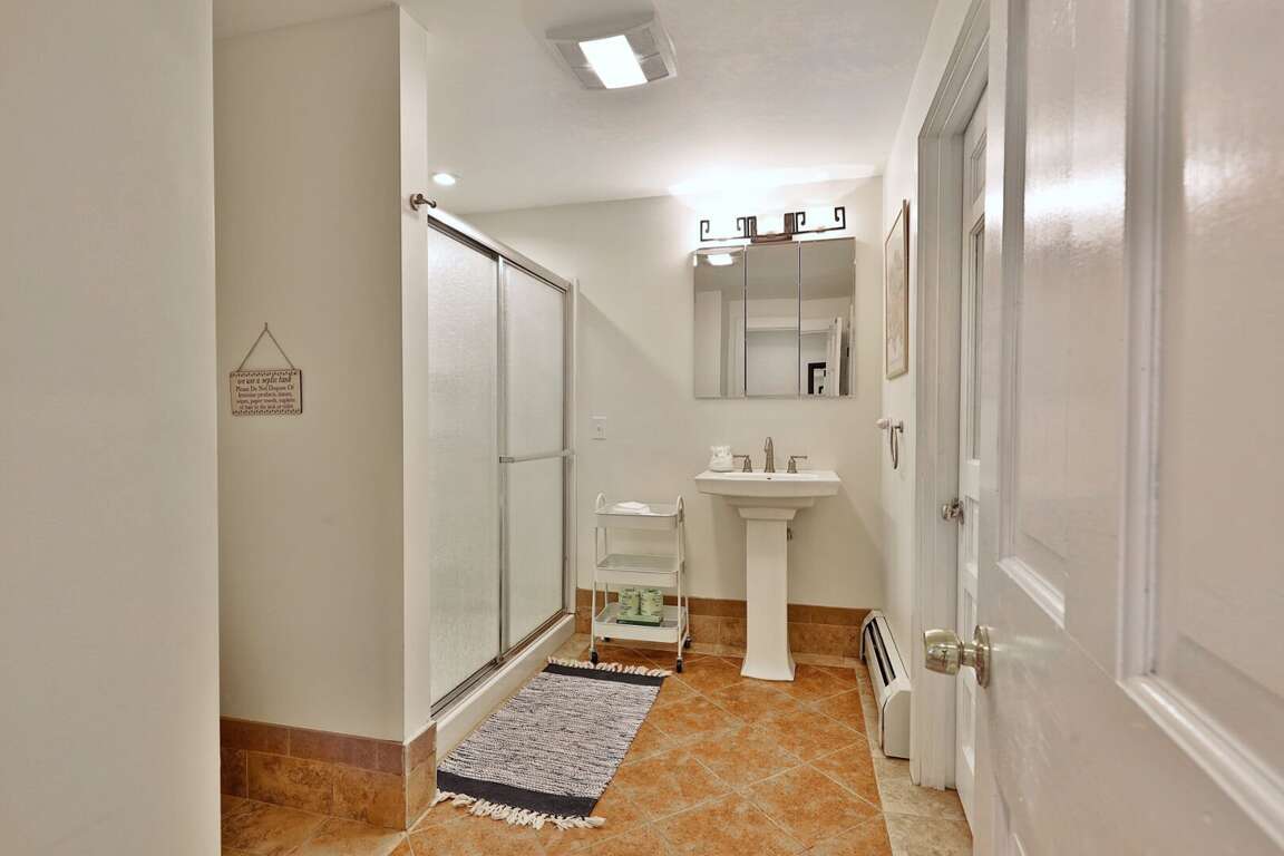 <li>Walk out basement: Head downstairs and you'll find the two bedrooms - one with queen bed and twin trundle underneath, and the other with king bed and bunk beds. You'll also find the full bathroom with shower and laundry room with washer and dryer.</li>