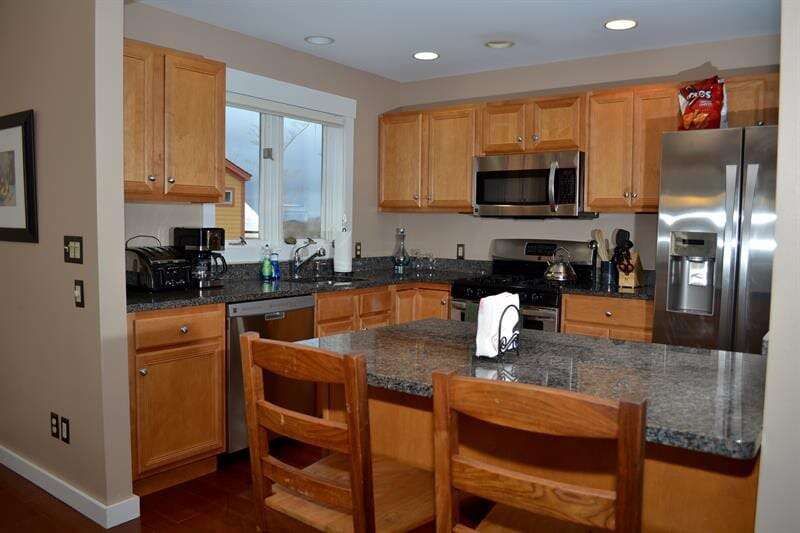 <p>The fully equipped kitchen boasts modern appliances, cookware, and a <strong>BBQ grill</strong> on the deck for preparing meals with ease. The dining area is perfect for shared meals while taking in the scenic backdrop. Entertainment options include a <strong>pool table</strong>, television, and sound system, ensuring fun and relaxation for all.</p>