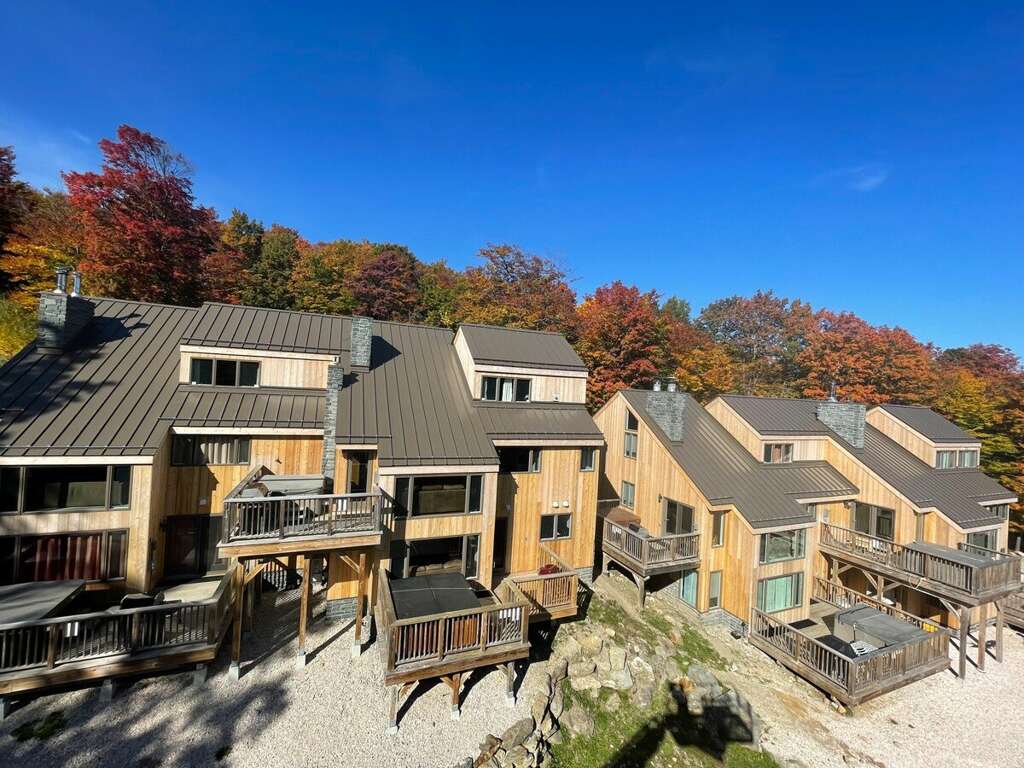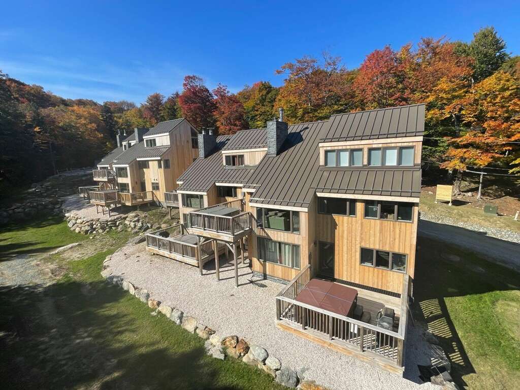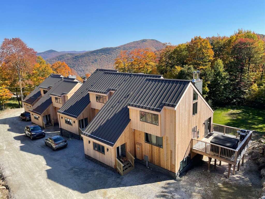 Experience the comfort of Trailside Village 3, a luxury cabin nestled amidst the serene mountain views in Killington, a perfect vacation rental for relaxation.