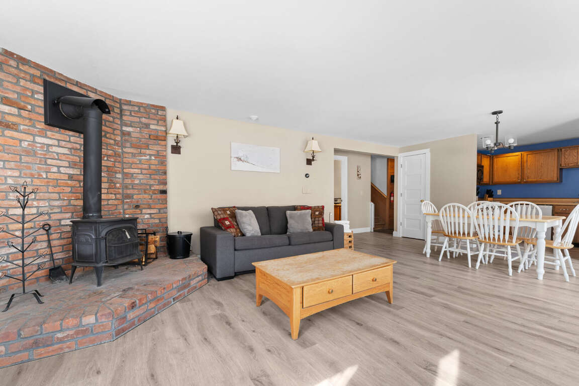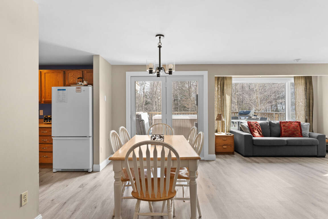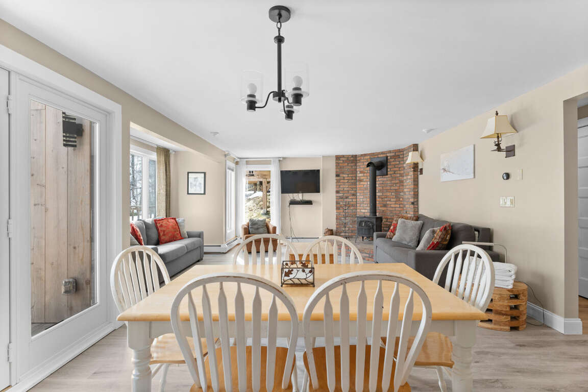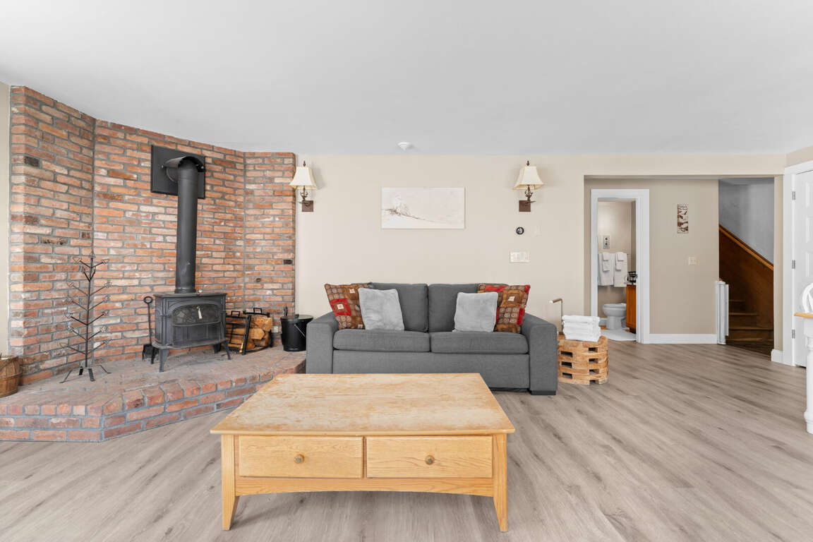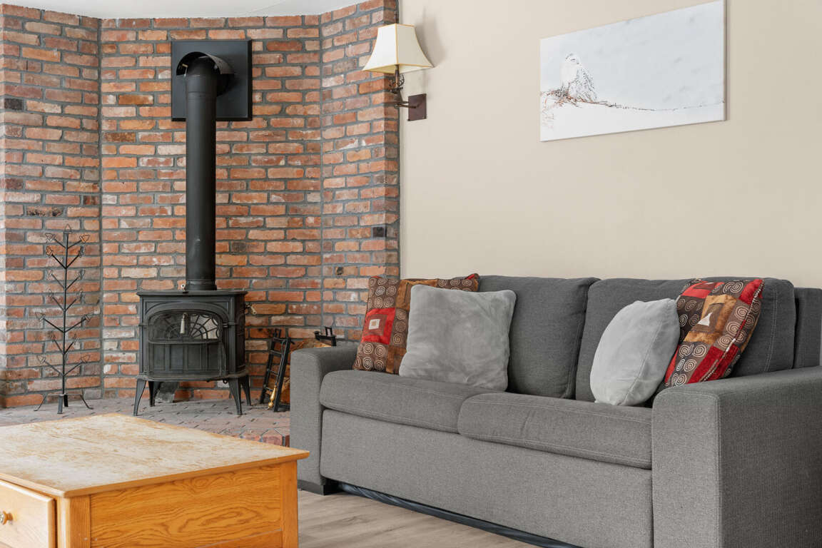 <p>The cozy living room invites you to unwind by the<strong> wood-burning stove</strong> (firewood included), while the private deck boasts an <strong>outdoor hot tub</strong> (seasonal fee applies) and a BBQ grill, perfect for relaxing evenings with mountain views. Prepare meals in the<strong> </strong>fully equipped kitchen, complete with modern appliances, cookware, and dining essentials.</p>