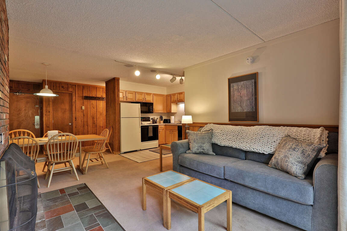 <p>Inside, you'll find a warm and inviting living space with a gas <strong>fireplace</strong>, perfect for snuggling up with a good book or gathering with friends and family for some quality time. The living room also features a comfortable sofa and chairs, a large flat-screen TV with streaming services, and high-speed WiFi throughout the condo. The fully equipped kitchen is perfect for preparing meals and features a stove, oven, microwave, dishwasher, and all the cookware and utensils you need to whip up a delicious feast. Enjoy your meals at the dining table, which seats six comfortably, or head outside to the balcony to dine al fresco while taking in the <strong>views of the surrounding mountains</strong>.</p>