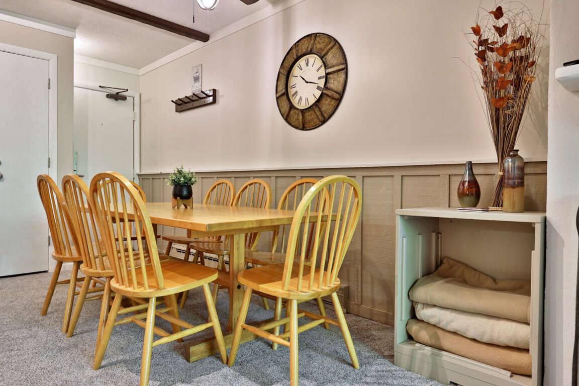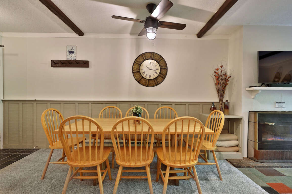 <p>The condo features a spacious living area with high speed WiFi, smart TV, and a gas fireplace, perfect for unwinding after a day on the slopes. The fully equipped kitchen includes modern appliances such as a refrigerator, stove, oven, microwave, dishwasher, and coffee maker, making meal preparation a breeze. Enjoy your meals at the dining table or step out onto the patio for a breath of fresh mountain air.</p>