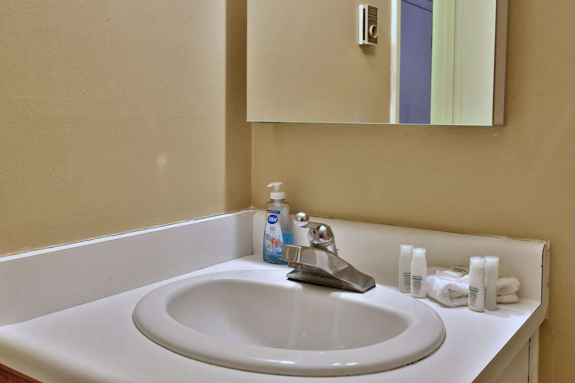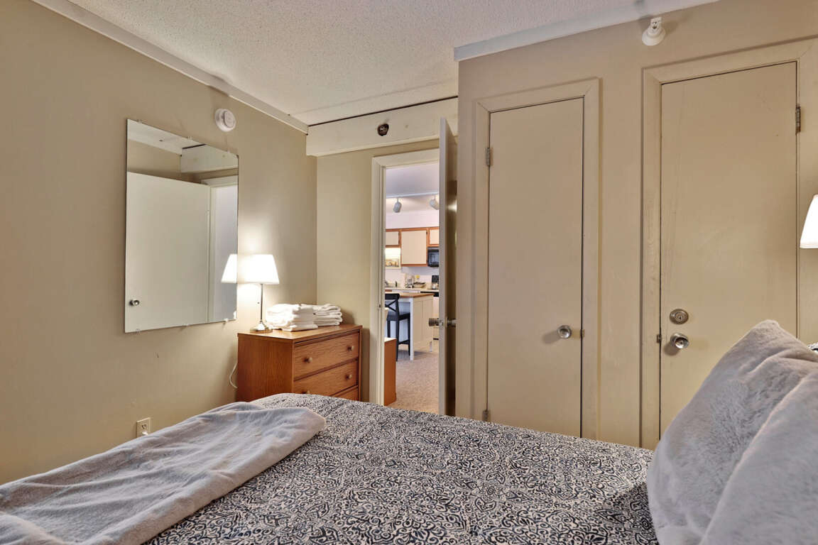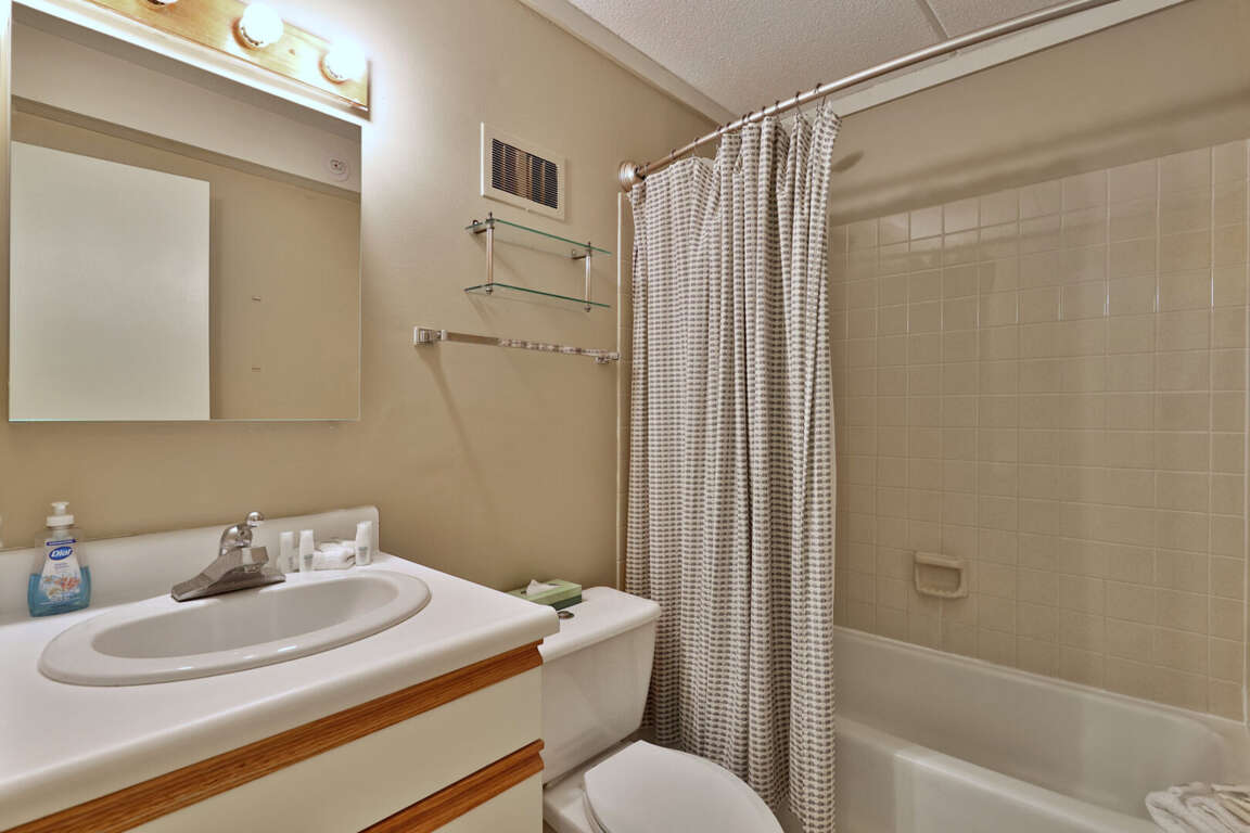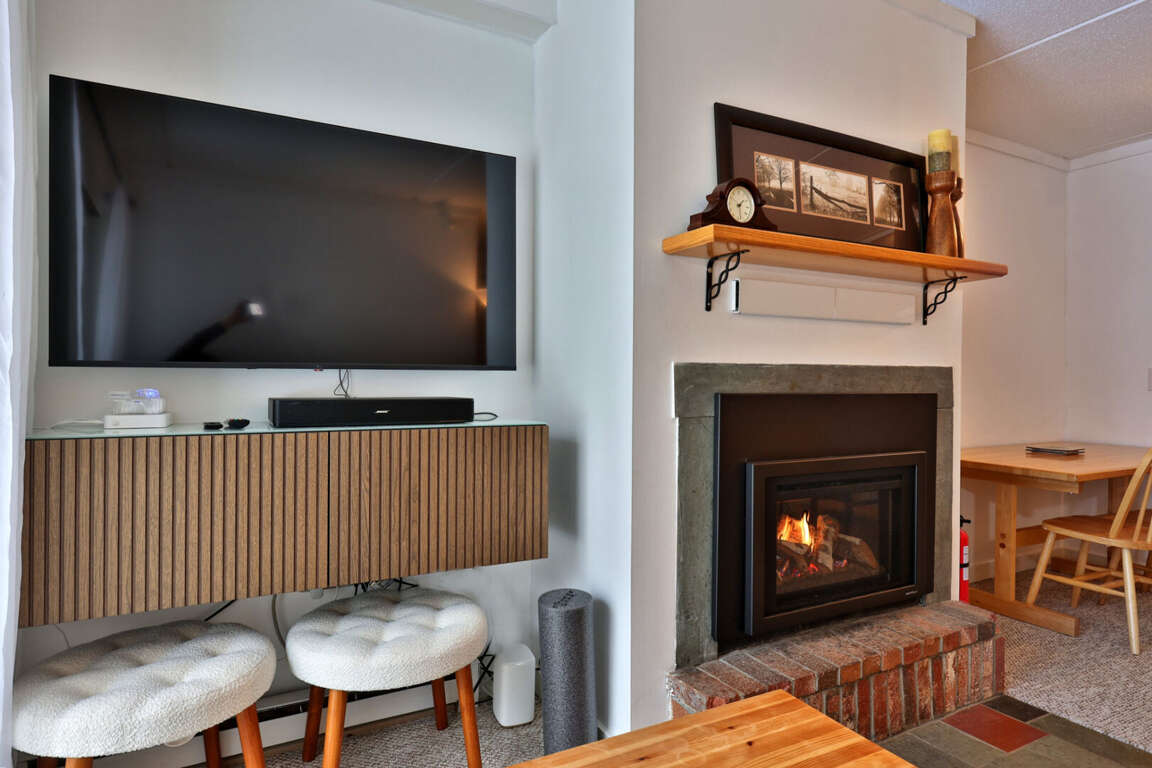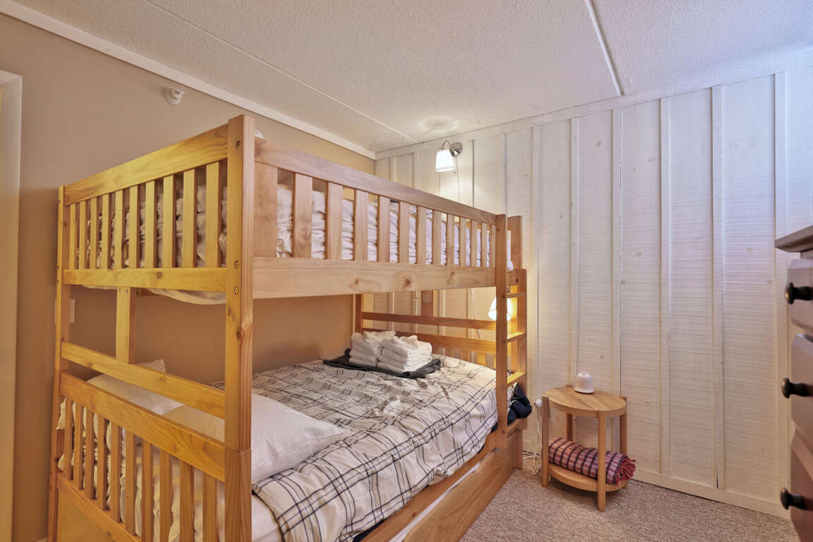<p>The condo features a comfortable queen bed in the master bedroom, a full over full bunk bed in the second bedroom with trundle bed, and a sleeper sofa in the living room, accommodating up to six guests. The single bathroom is well-appointed and includes all the essentials for a comfortable stay. The living area is designed for relaxation, complete with a gas fireplace, smart TV, and board games for entertainment. </p>