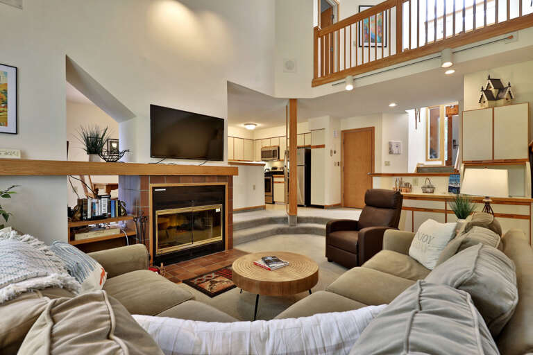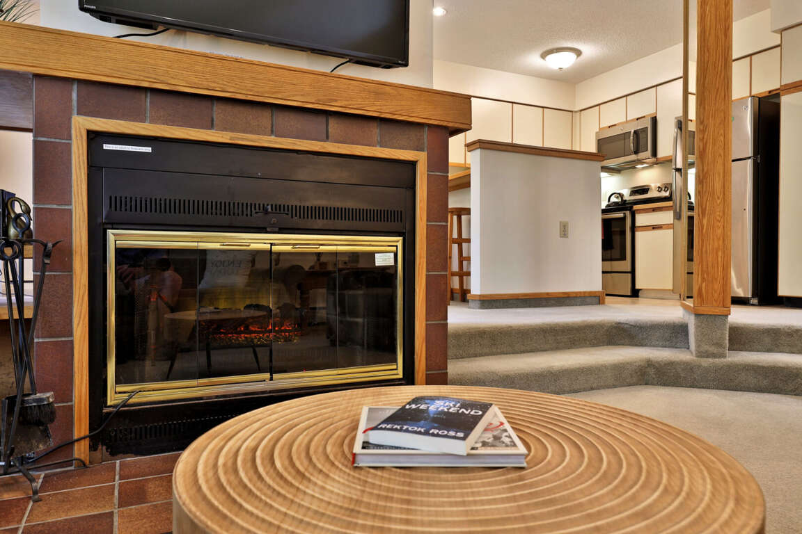 <li>Cozy living area with smart TV and wood fireplace</li>