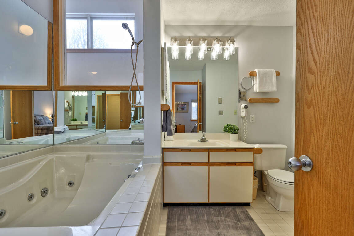 <li>Upstairs Primary Bedroom: <strong>Queen bed </strong>with ensuite bathroom featuring a jetted jacuzzi tub and walk-in shower.</li>