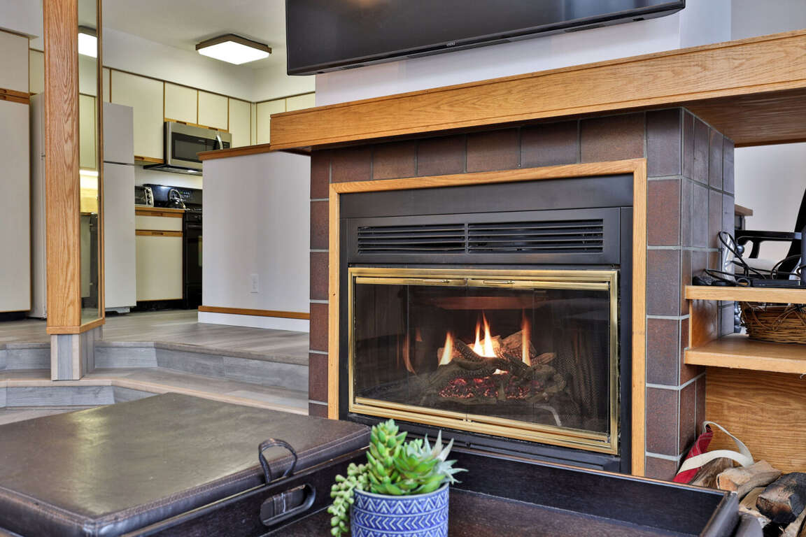 <li>Cozy sunken living room with a hassle-free wood <strong>fireplace </strong>and large windows with serene forest views.</li>