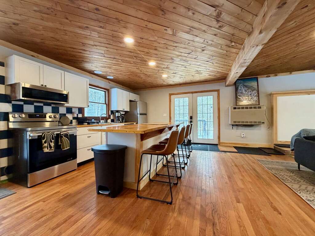 <p>Upstairs you’ll find an <strong>open living and kitchen area</strong> with stainless appliances, a dishwasher, microwave, and a long breakfast bar with four stools. The living room has sofa seating, a <strong>75 inch smart TV</strong>, and <strong>windows</strong> looking into the trees. This level has <strong>three bedrooms</strong>: one queen bedroom with a desk and door to the wraparound deck, plus two bunk rooms with custom twin-over-twin bunks with real stairs. A <strong>remodeled full bath</strong> with tiled shower and a stacked <strong>washer/dryer</strong> sit just off the main space.</p>