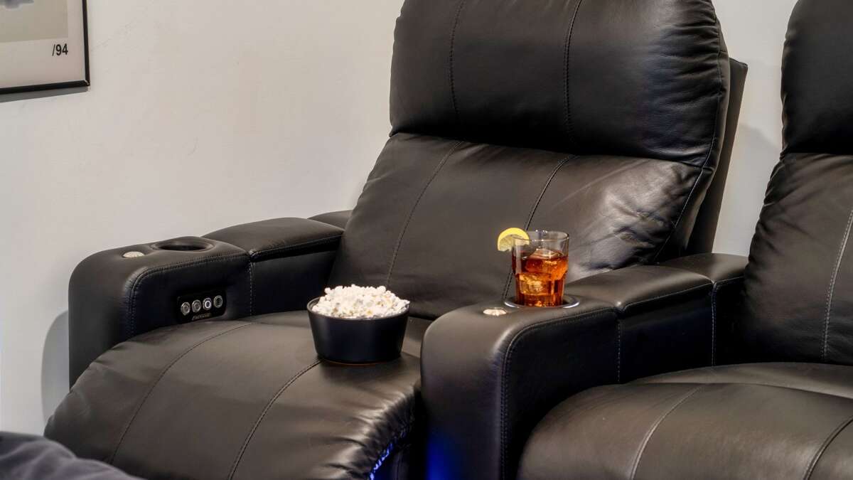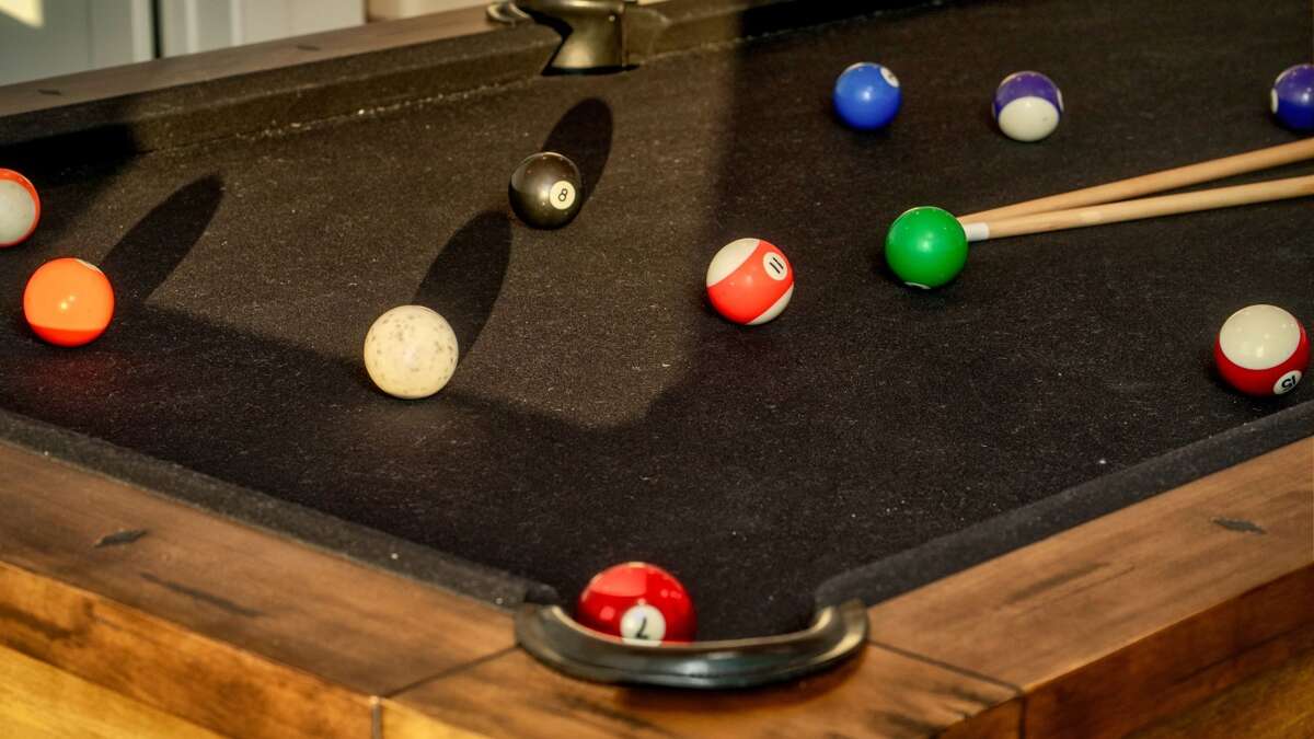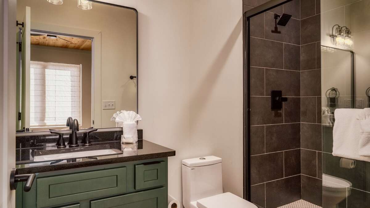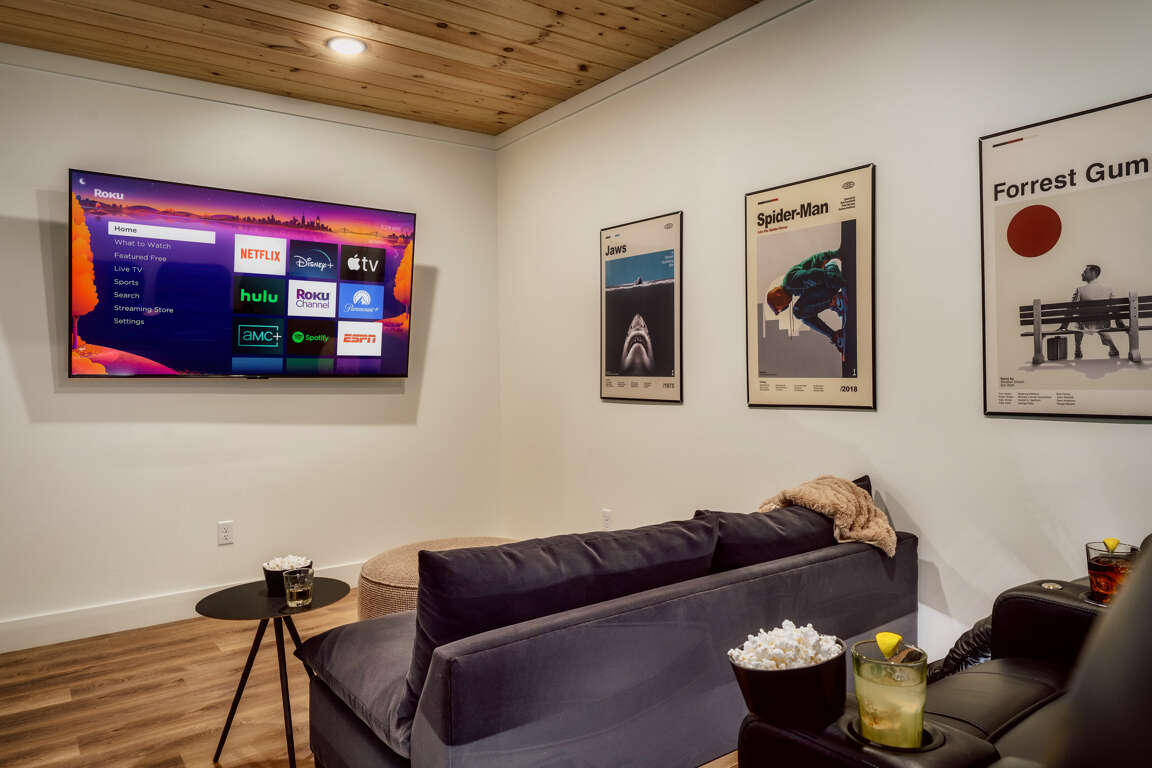 The open-concept cabin boasts a fully equipped kitchen, a spacious dining area, and a beautifully appointed living room with large windows to take in the breathtaking mountain views. For entertainment, enjoy the game room complete with a pool table, arcade games, and more. There's also a cozy theater room with large futon-style sofas, perfect for movie nights.