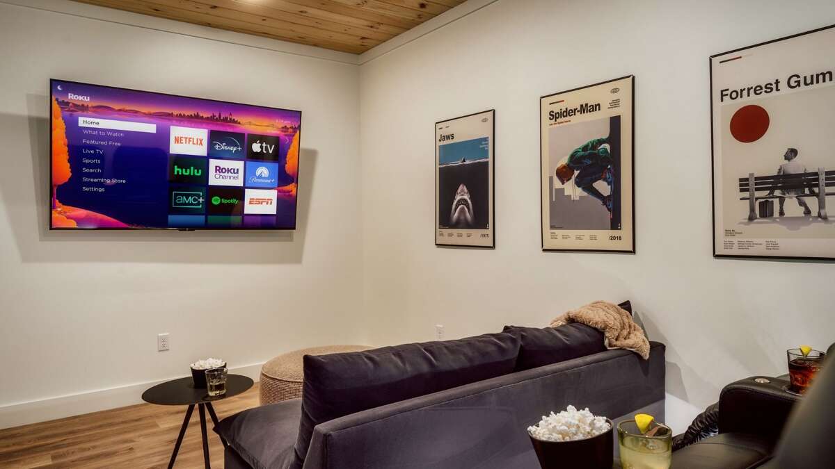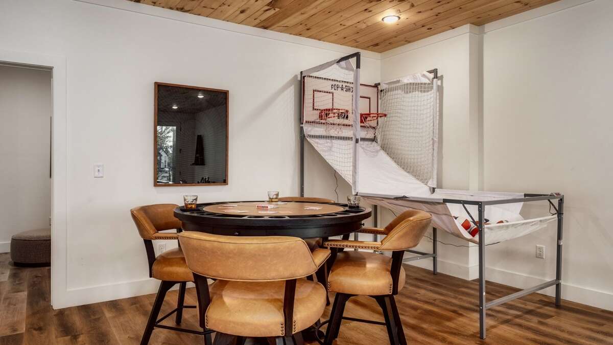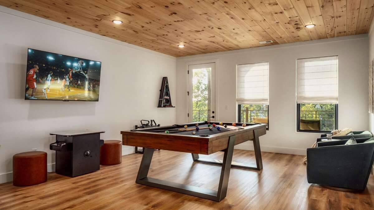 The open-concept cabin boasts a fully equipped kitchen, a spacious dining area, and a beautifully appointed living room with large windows to take in the breathtaking mountain views. For entertainment, enjoy the game room complete with a pool table, pop-a-shot basketball, card table, arcade games, and more. There's also a cozy theater room with large futon-style sofa, movie style chairs, perfect for movie nights.