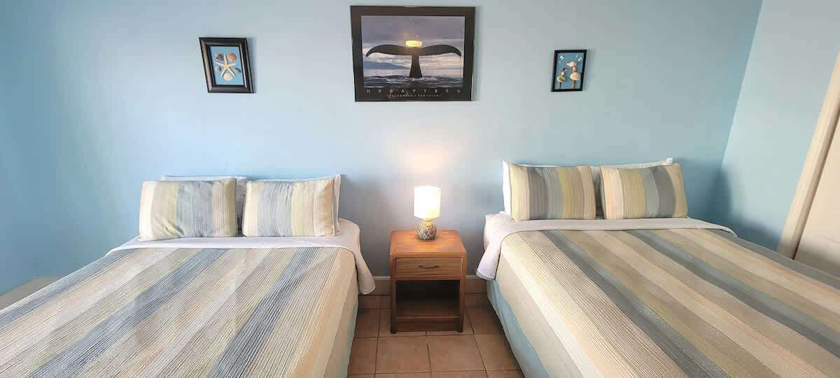 Downstairs in the spare bedroom are 2 double sized beds along with the kitchen, tables, 2 couches, and flat screen TV. One couch folds down into a small bed.