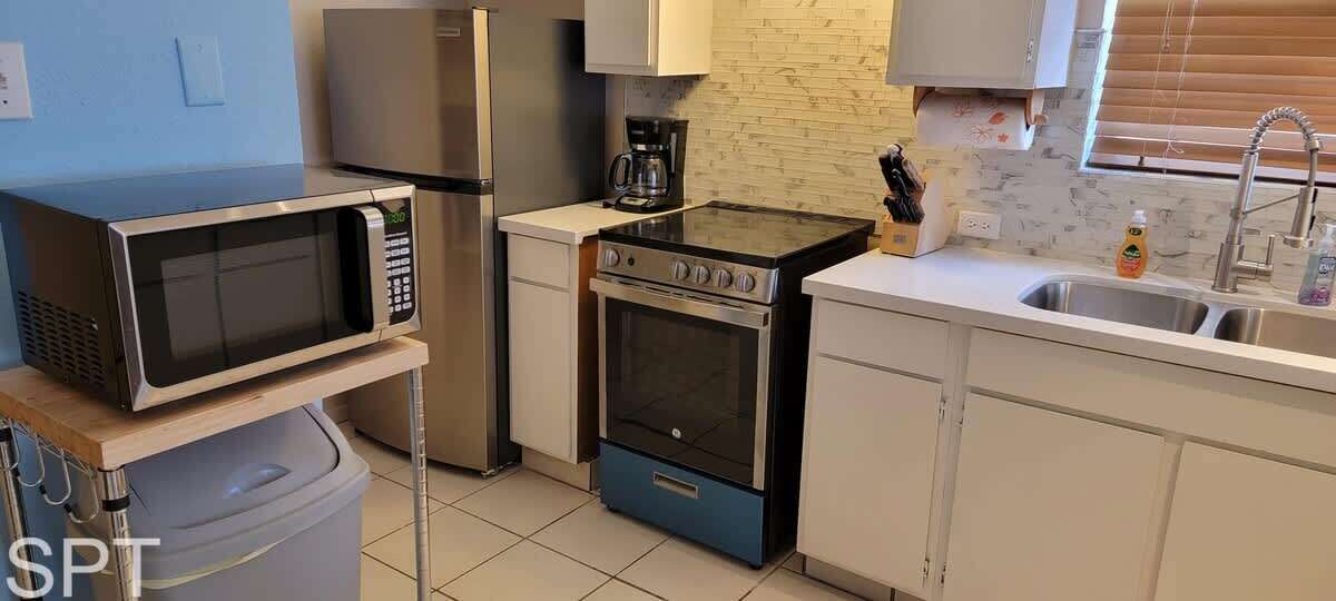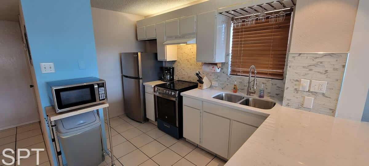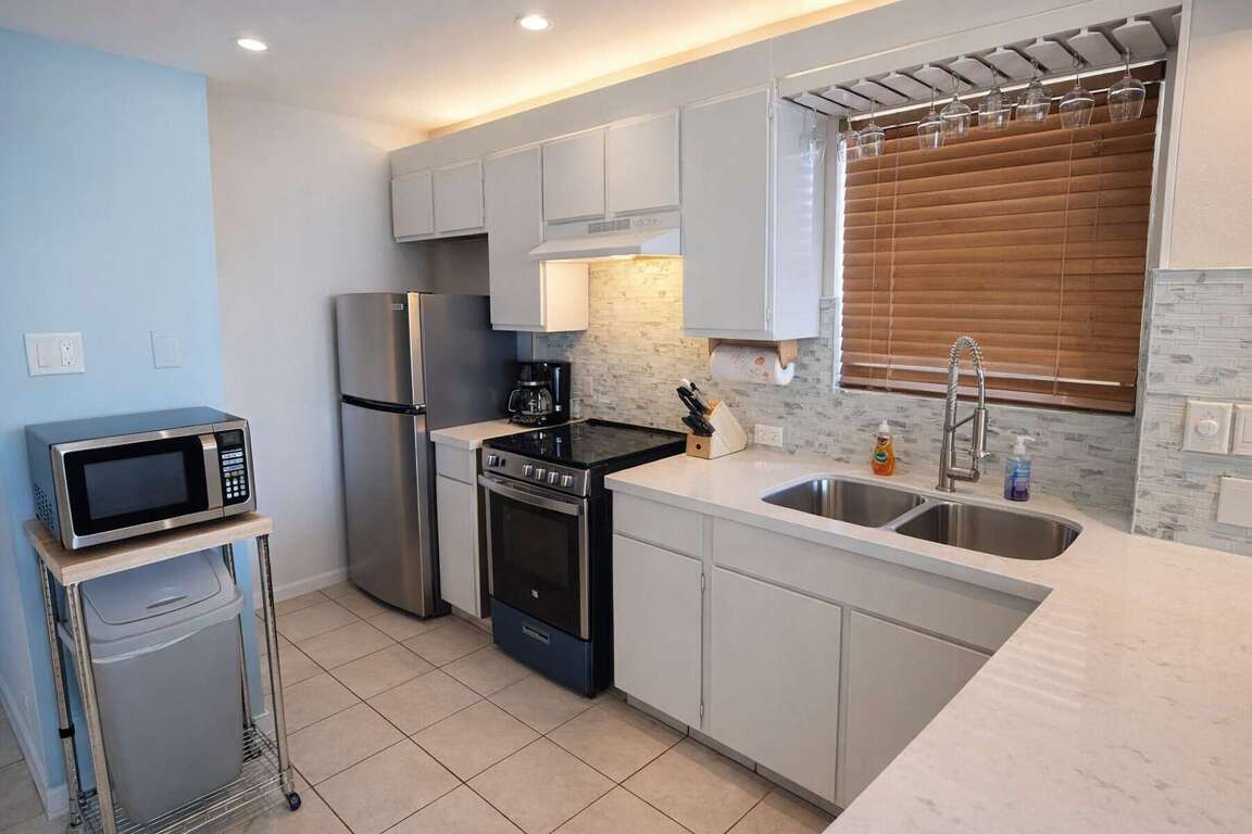 You will find comfortable furniture, white quartz counters, and all new stainless appliances.