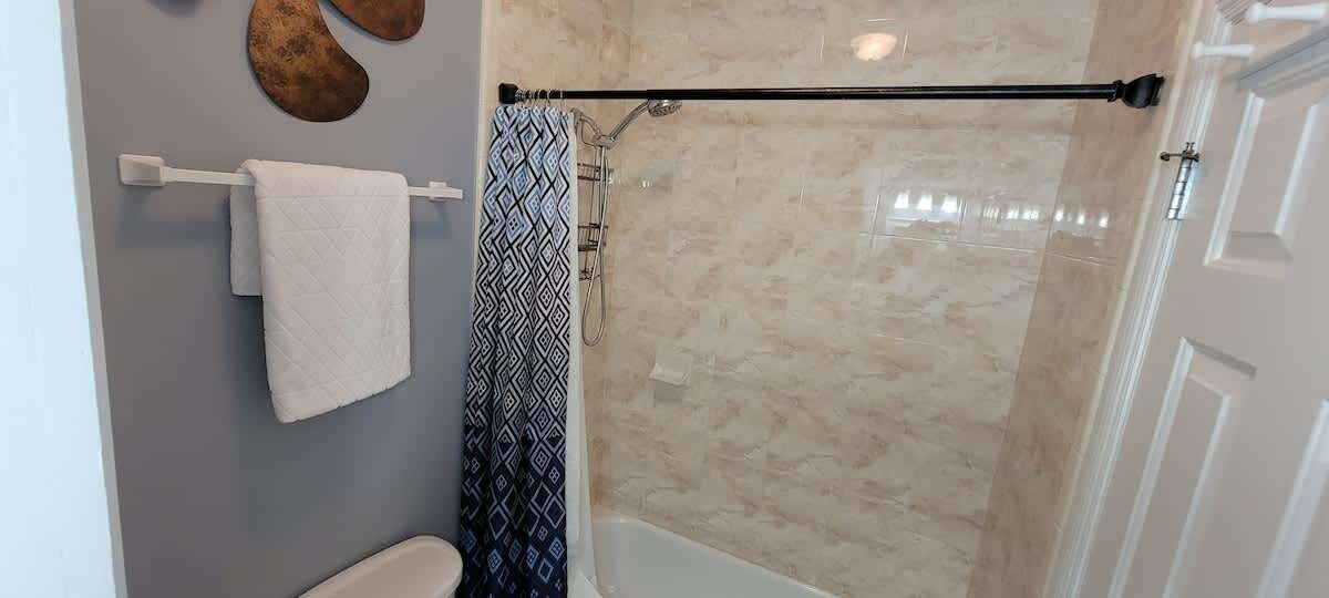The master bedroom has a queen bed with an en suite full bathroom for privacy. The 2nd bedroom has an adult-sized bunk bed with a queen bed on the bottom, full-sized bed on top, and new temperpedic-style mattresses. There is also 1 single bed. This bedroom is perfect for kiddos