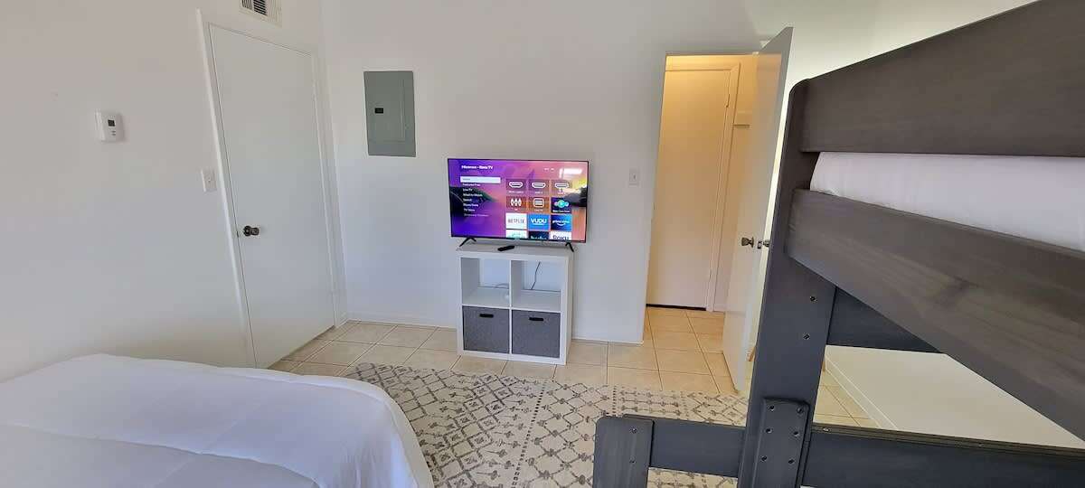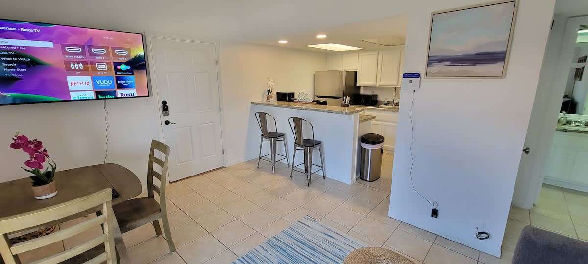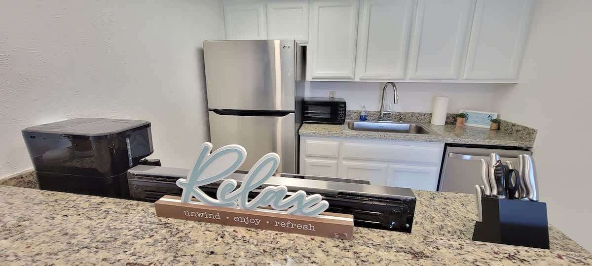 Remodeling done in June of 2022 consisted of new kitchen, painting, and new furniture. It has very high ceilings and fans to make it feel spacious. The common area grounds have a cool retro vibe of a by gone era we think you'll dig. It is not brand new out there, we want that noted by our guests.