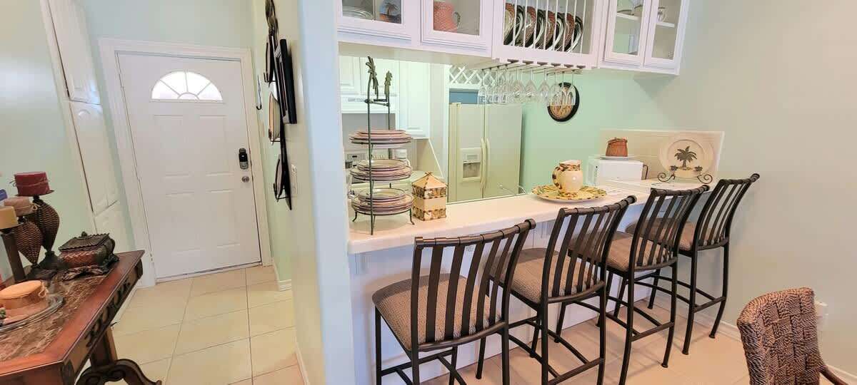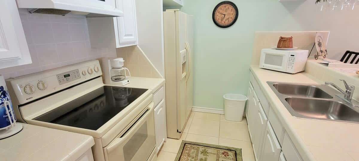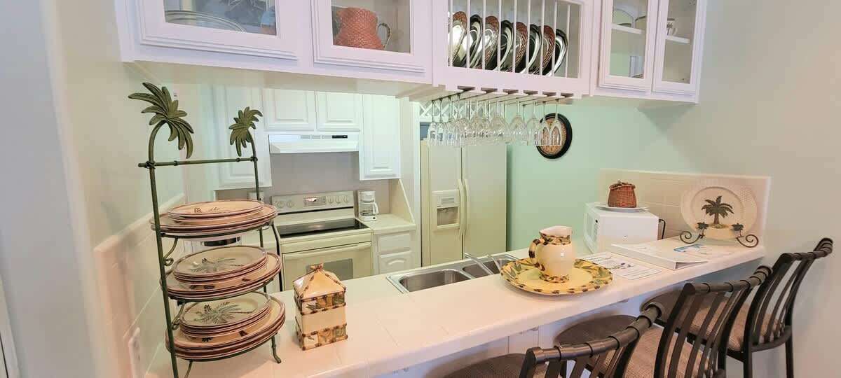 Our entire condo was repainted Jan 1 of 2023 so it is a fresh, newer and clean feel inside. The kitchen has open concept with a nice counter top / bar that you can easily serve a family meals off of. The kitchen is fully equipped with pots/pans/dishes/utencils/a blender and coffee maker so ready for you