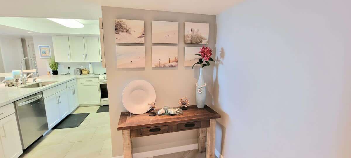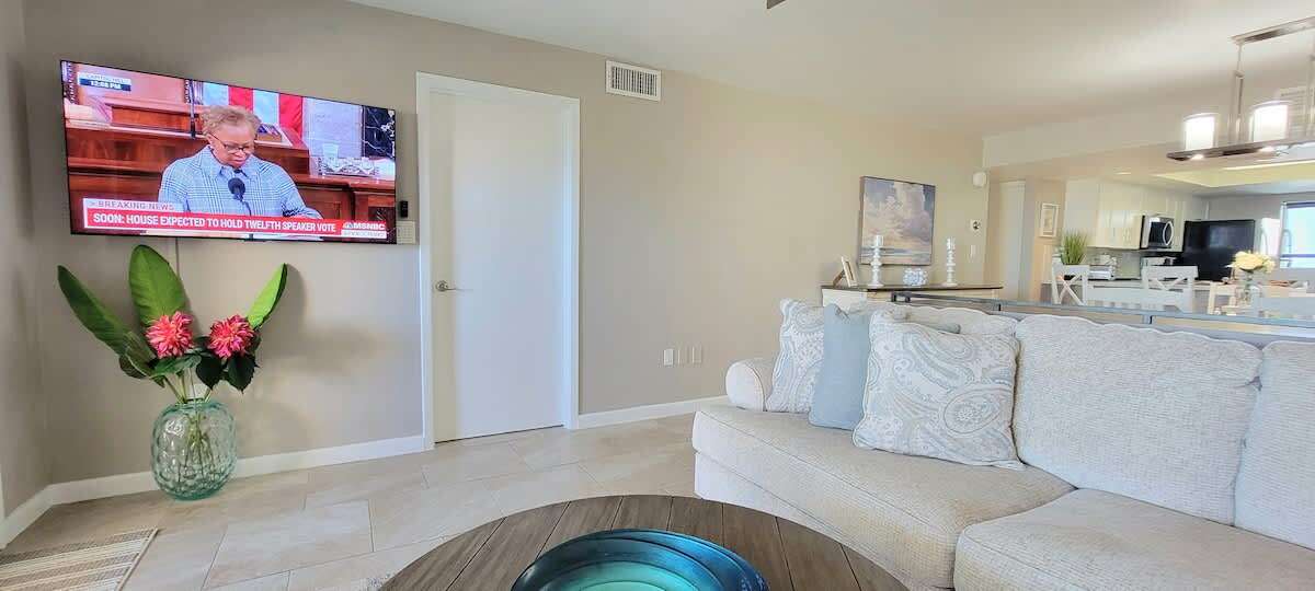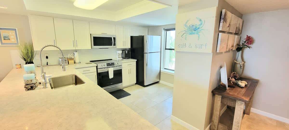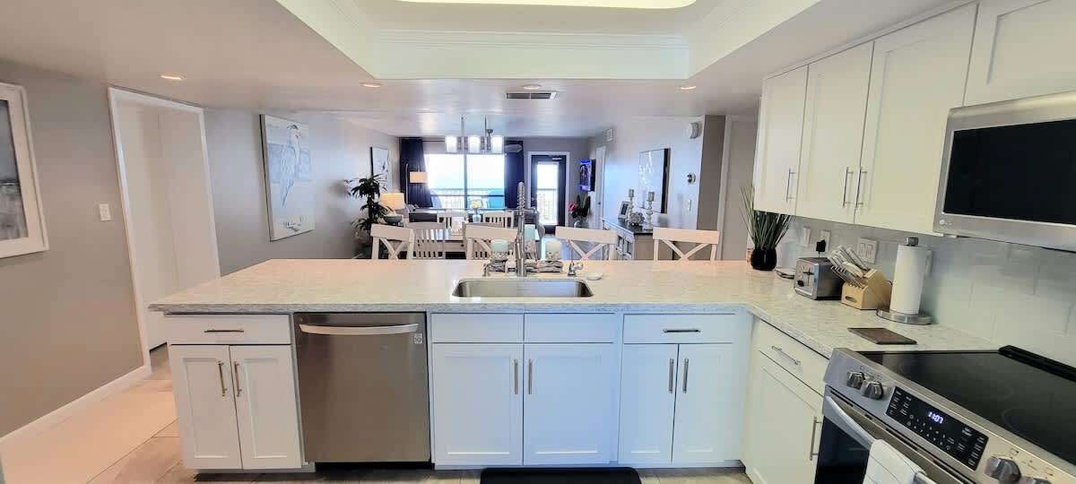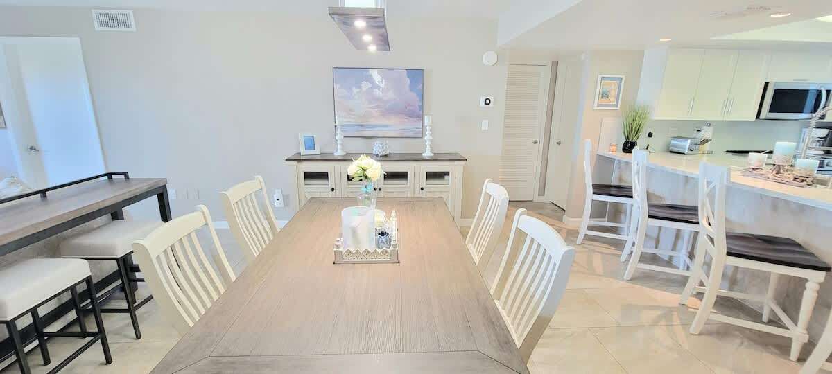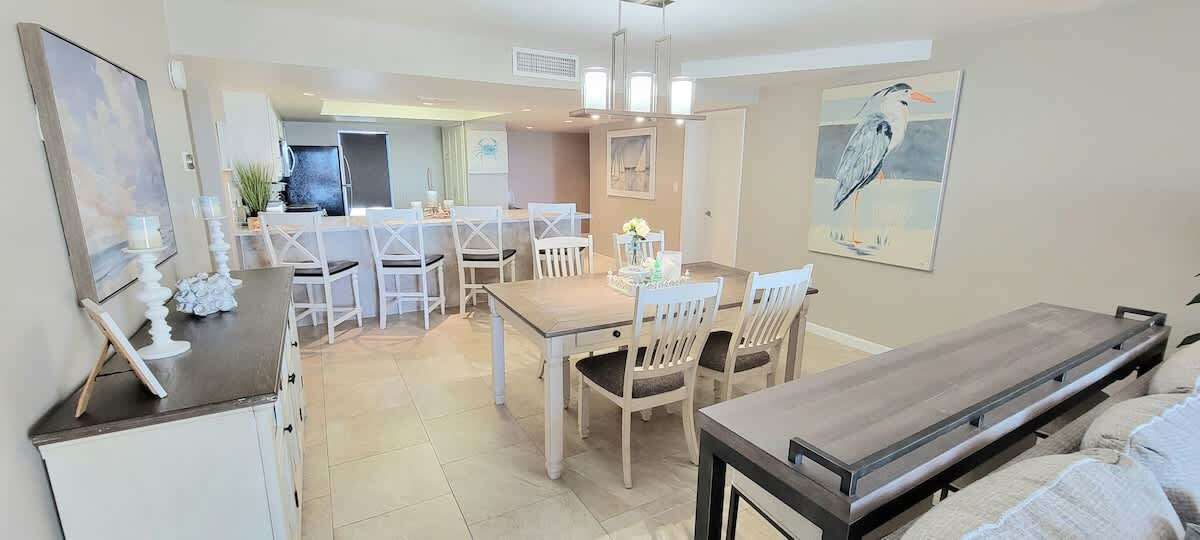 Enjoy the open concept with new kitchen and appliances, open to dining table & living area with large windows to view the pools and beach. Uniquely featured is a long, high top table with charging bar between the dining & living space that we find as a perfect spot for getting a little work done, or watching a game while still enjoying the beach views.