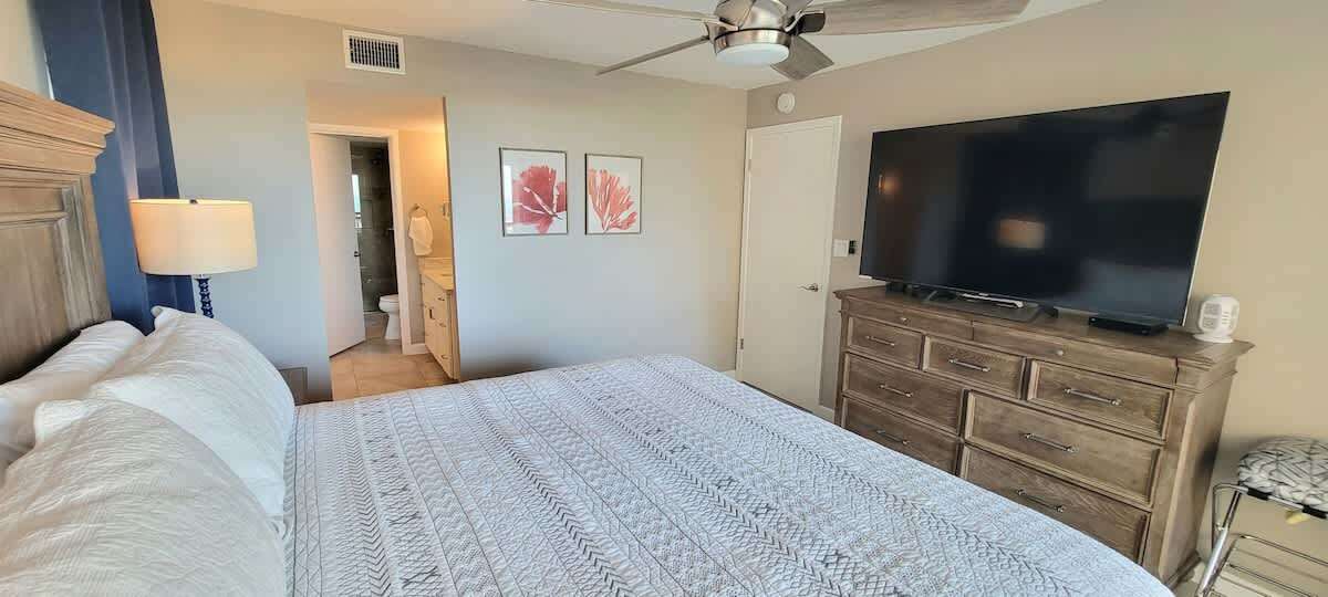 Primary Bdrm - King size bed with ensuite walk-in shower, 65" HD 4K flat screen TV.
