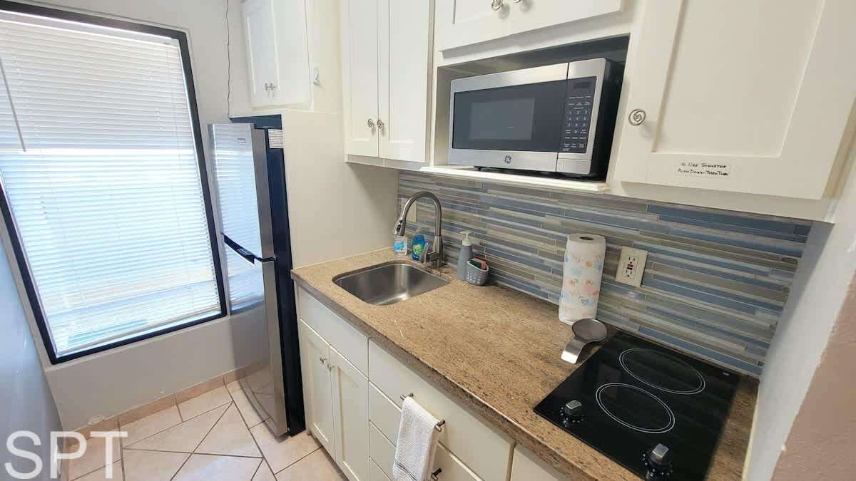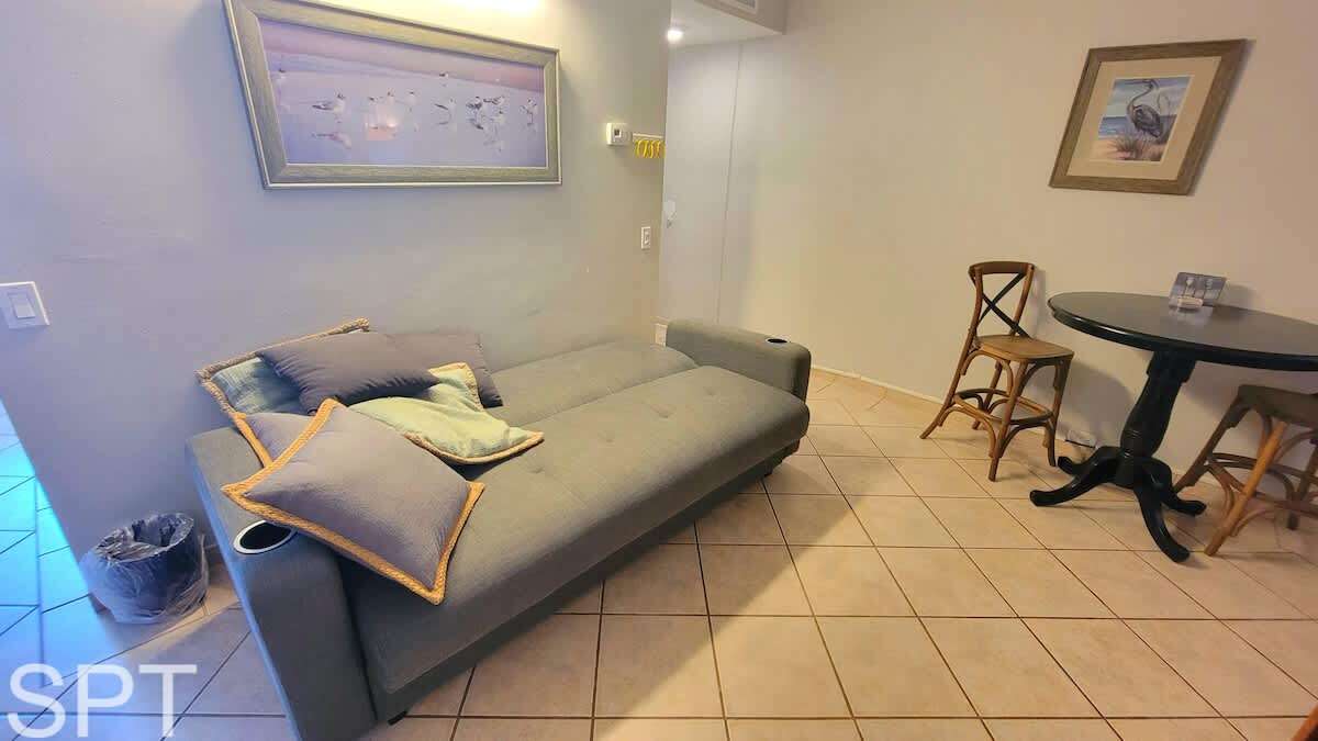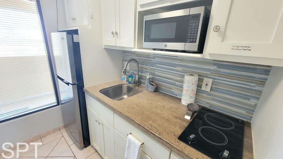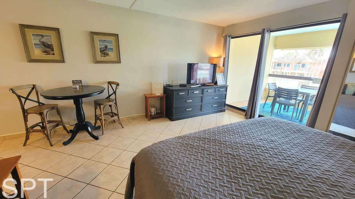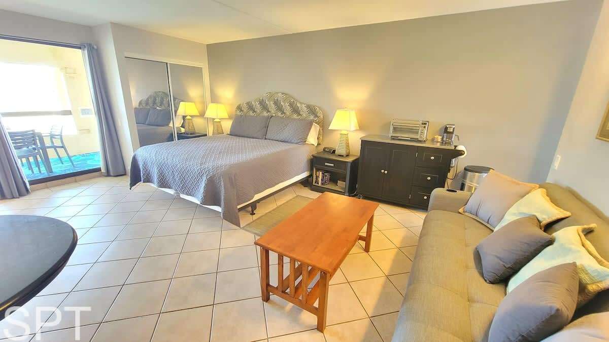 This older efficiency condo is similar to an oversized hotel room with a kitchenette and full bath. There is no separate bedroom, as everything is combined into one room. The condo includes a small fridge, hot burner, and microwave. While it's not super fancy, it's clean, neat, and offers a great location for paddleboarding in the calm channel.
