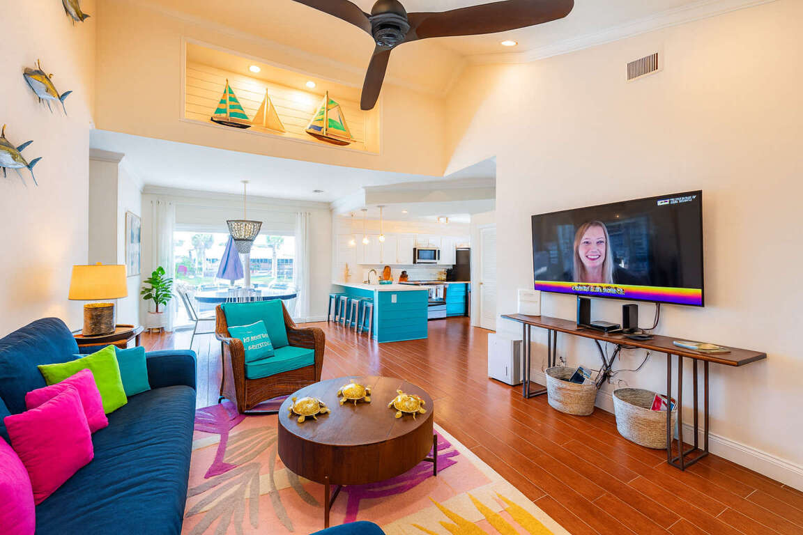Because the kitchen opens directly to the living area with high ceilings, the space feels bright and open for gathering after a day at the beach.