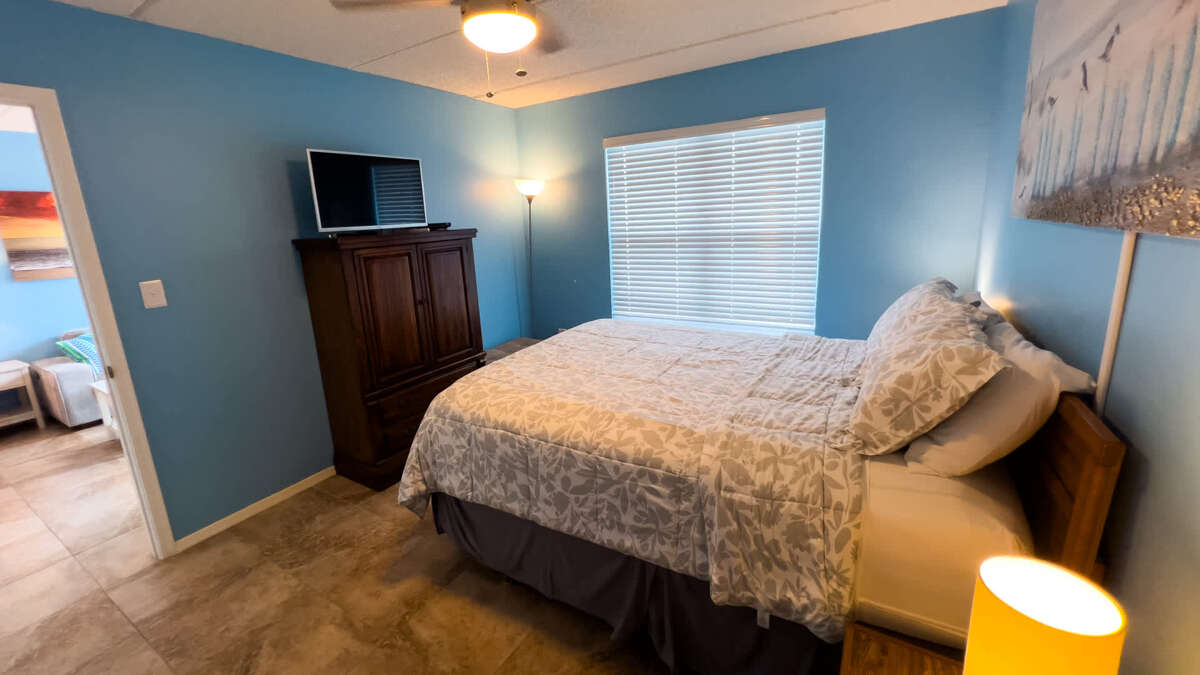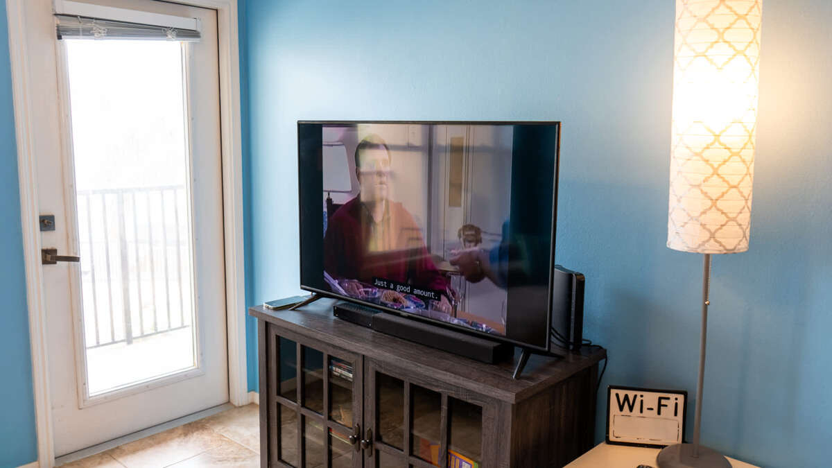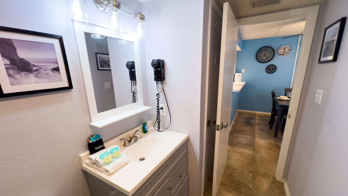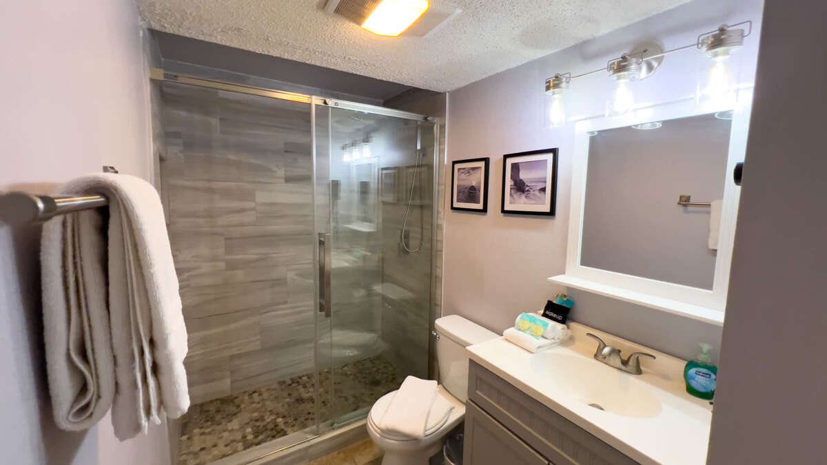 The condo is a colorful 2-bedroom, 1.5-bathroom unit accommodating allowing up to 7 max guests. A newly renovated bathroom has a stand-in shower with a rainwater type shower head. The living room TV is a 4K, 50-inch flat-screen with a Dolby sound bar and a Blu-ray/DVD player.