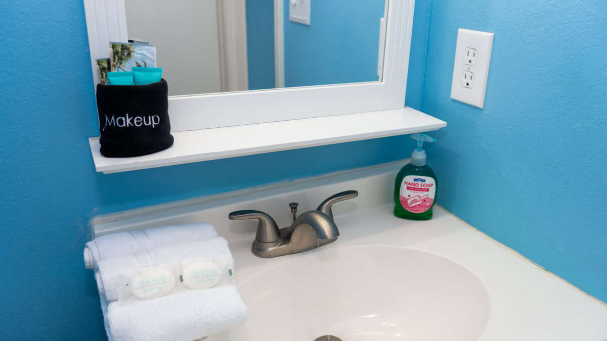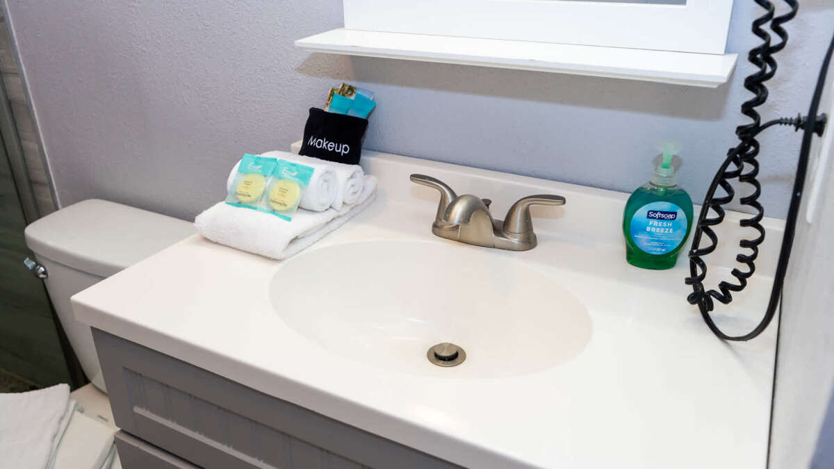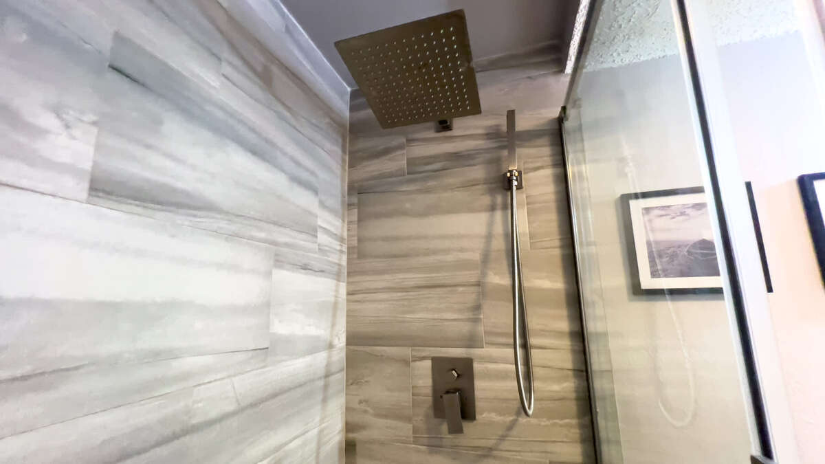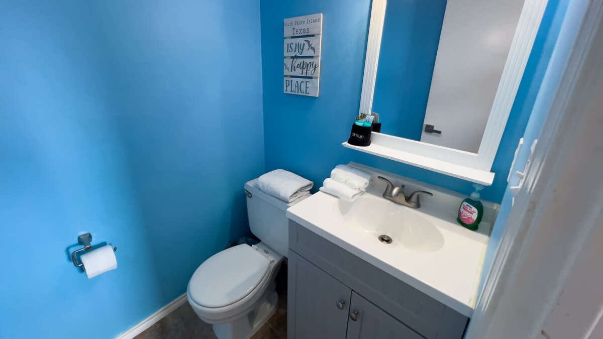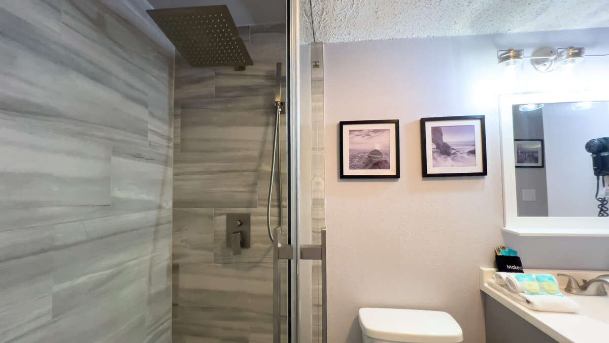 The condo is a colorful 2-bedroom, 1.5-bathroom unit accommodating allowing up to 7 max guests. A newly renovated bathroom has a stand-in shower with a rainwater type shower head. The living room TV is a 4K, 50-inch flat-screen with a Dolby sound bar and a Blu-ray/DVD player.