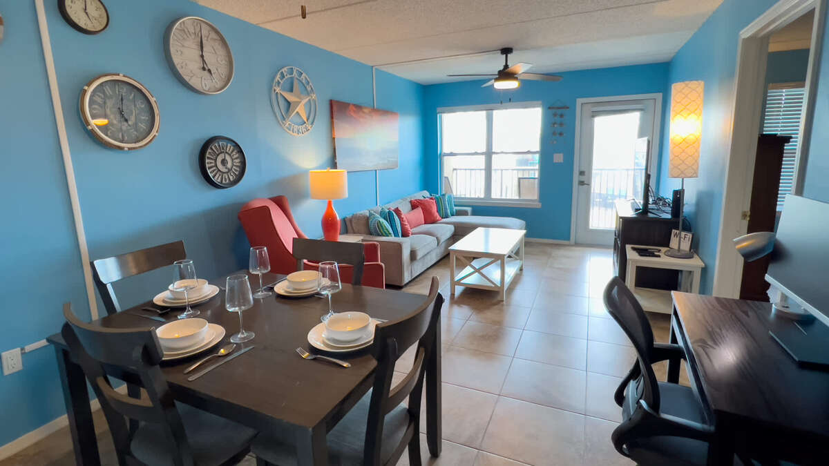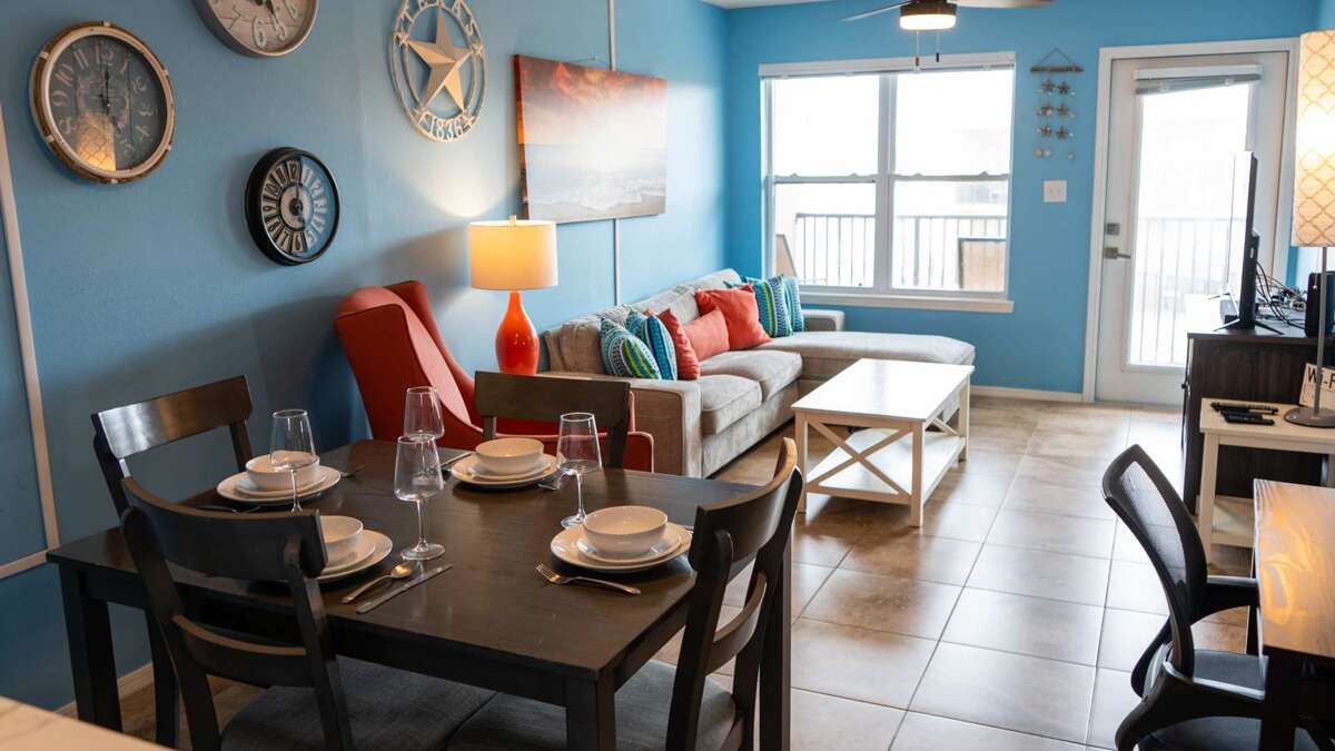 The living room features a spacious sectional sofa, providing ample seating around the TV. Off the living room, enjoy the private balcony and sea breeze of South Padre Island.