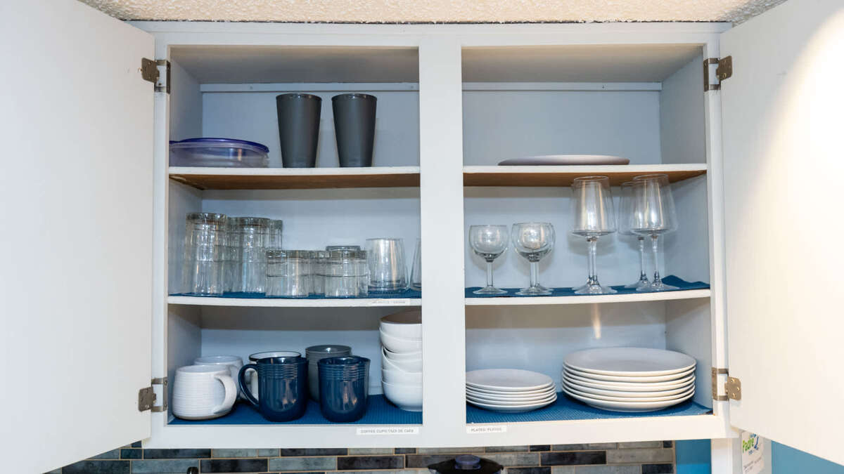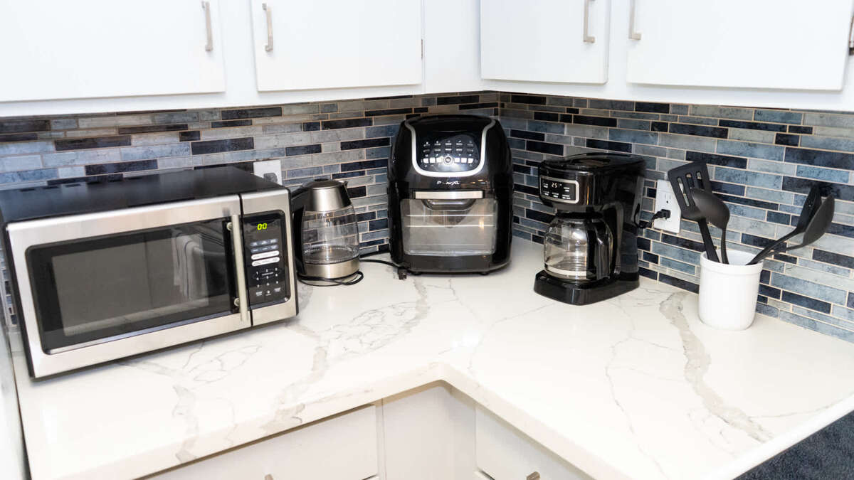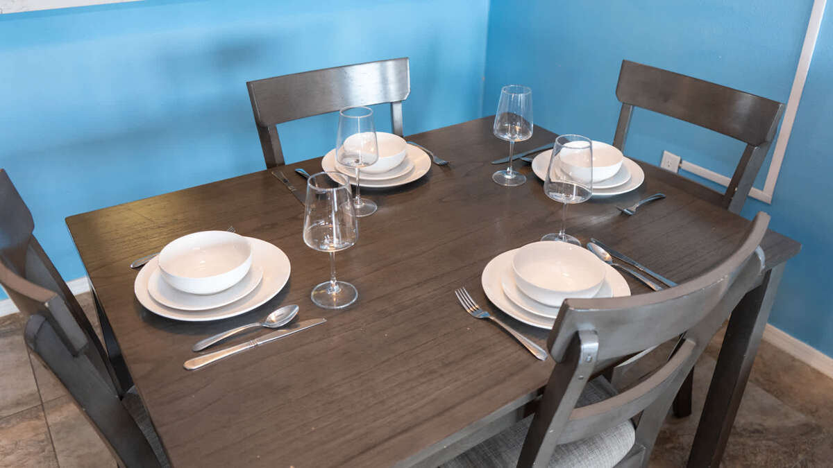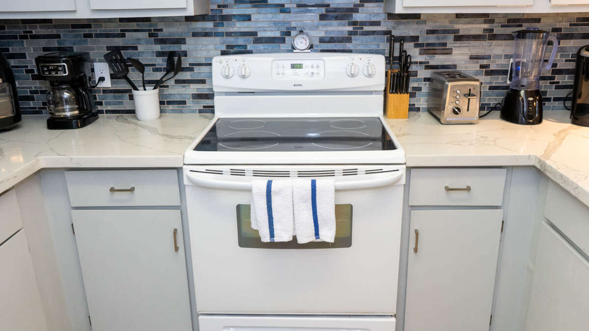 The kitchen is fully equipped with pots, pans, dishes, and more to save you money and time for family meals.