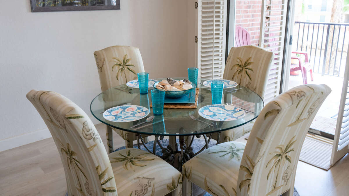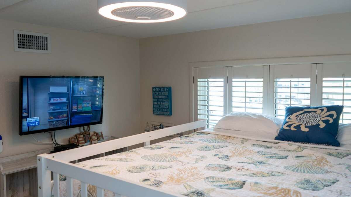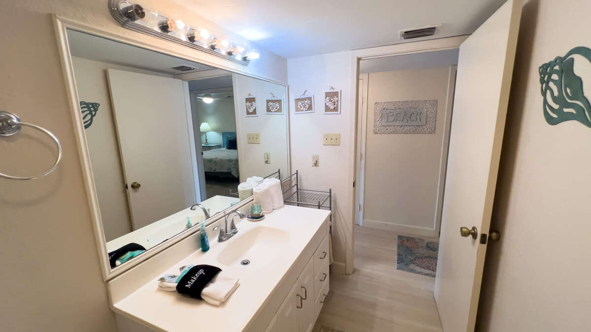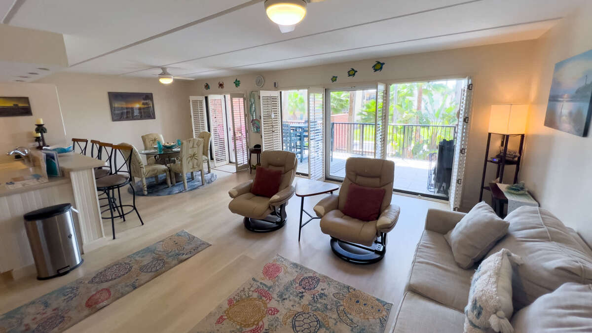 Their is a dining table plus additional seating at the eat in counter. Your living room has a large screen smart TV for movie apps & great for an end of the day wind down with your family that flows from the kitchen. The living room does have a sleeper sofa for extra sleeping space. One of the nice features of this space is a truly large outdoor patio that gives your family more space for reading, enjoying drinks, or using the outdoor BBQ grill.(please remember to bring propane as not provided) . This condo has larger than normal square footage, which makes it seem larger compared to most two bedroom condos on SPI.