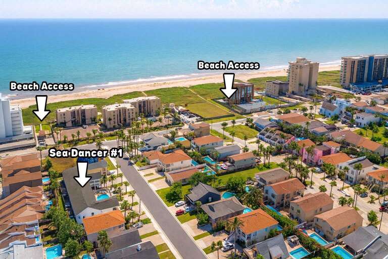 The Dancer complex is 200 yards to beach & we feature our plus sized 1 bedroom condo w/ full kitchen, patio & fun pool This Sea Dancer complex is a very well maintained property with 8 individual condos that is just ½ a block to public beach access making it easy for a day at the beach without the beachfront price Property is professionally managed by local South Padre Island Trips at 2600 Padre Blvd. We do offer free linen exchange for stays over 3 nights. less than 1 block to beach on the east side of Padre Blvd the main drag Recommend BBs Taxi or City Taxi as uber and lyft rarely have drivers Property is professionally managed locally by South Padre Island Trips / South Padre Trips at 2600 Padre Blvd, 78597 with our office open 7 days a week 9 am to 5 pm should you need anything or help :)