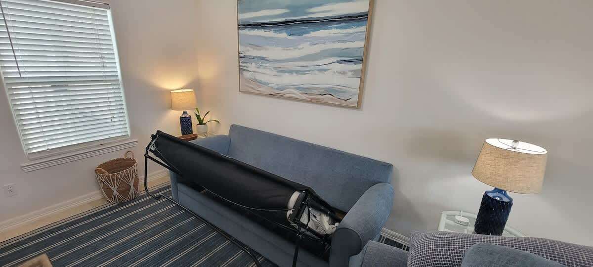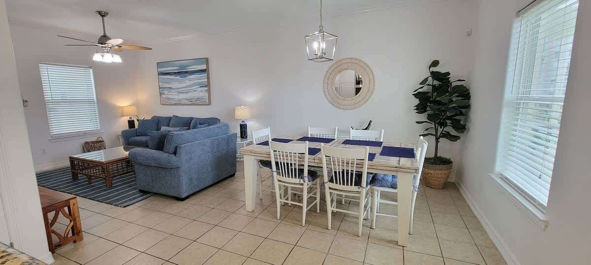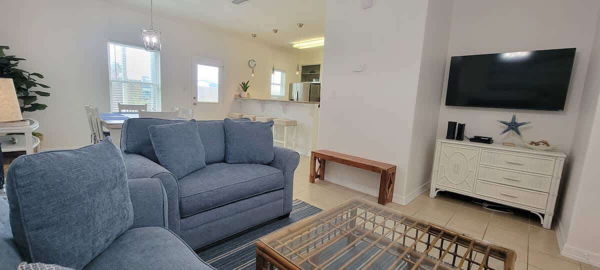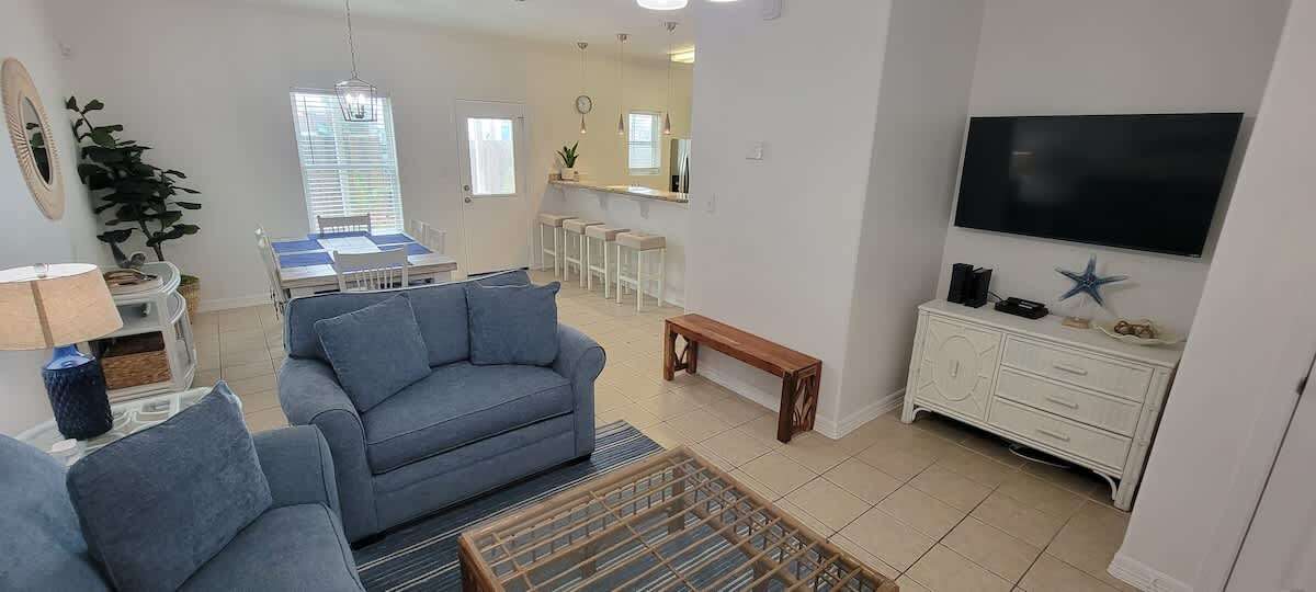 The living room features a sofa bed couch plus a 2nd couch and smart TV for movies at night or family games on the coffee table. Dining has 6 seats, plus 4 more counter height stools so whomever is the Chef can interact with all :)