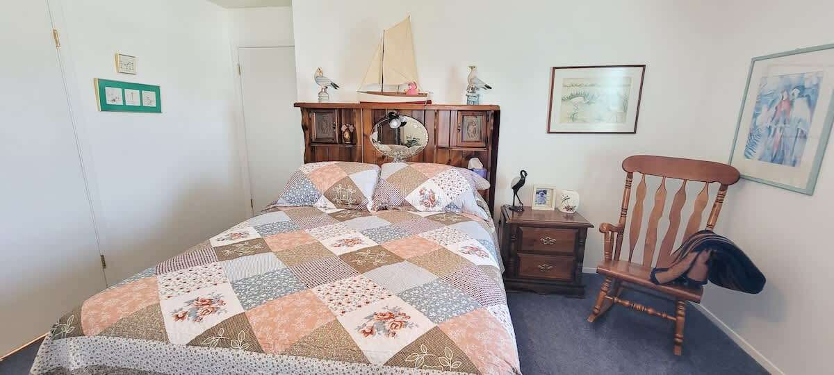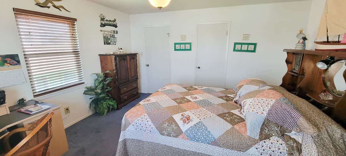 Downstairs is the “captain’s quarters” with a small efficiency style 1 bedroom bathroom, and a queen bed for great privacy that has a door out to the 1 car garage stall you may use.