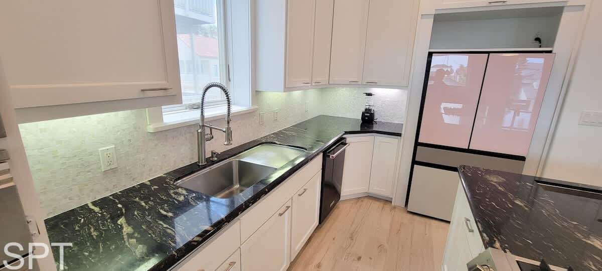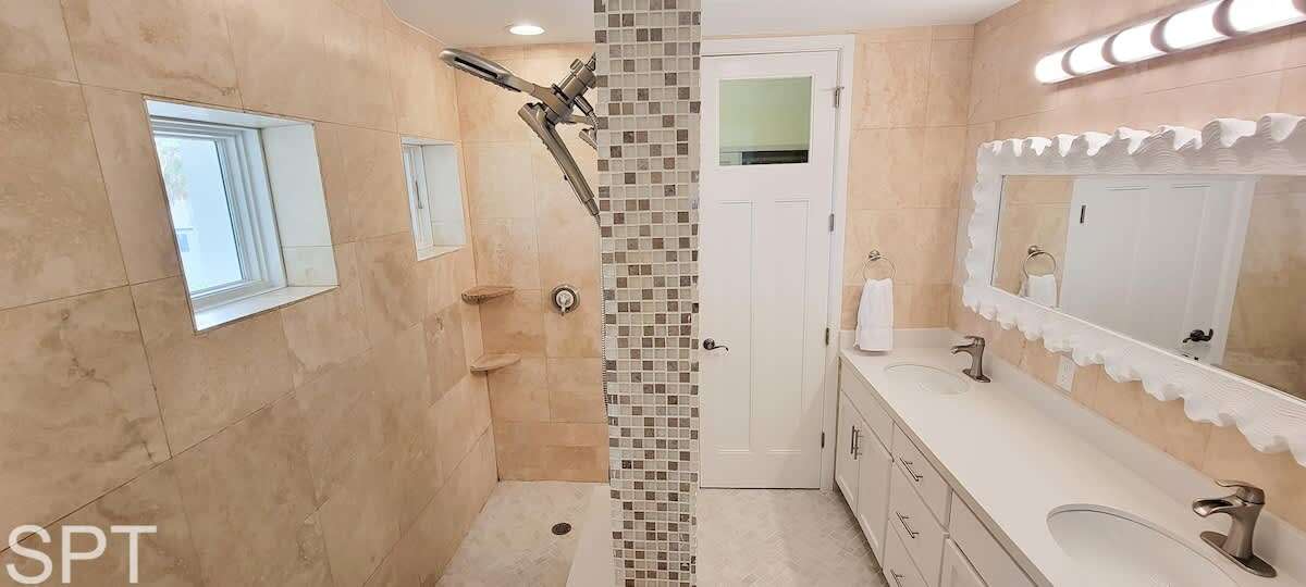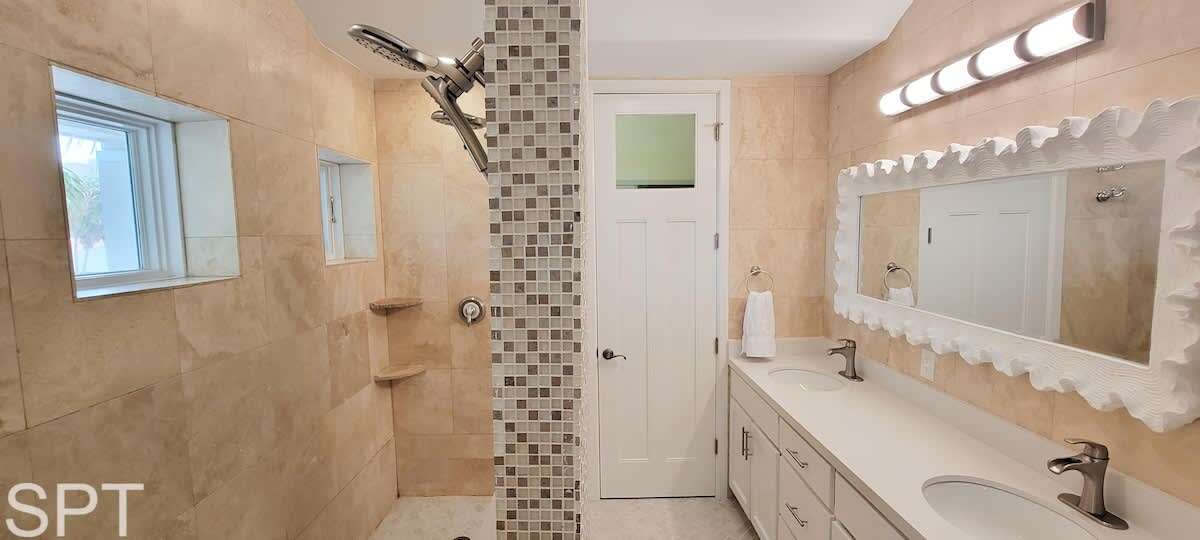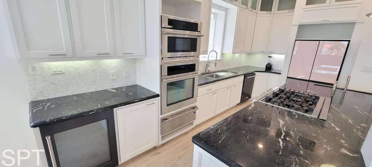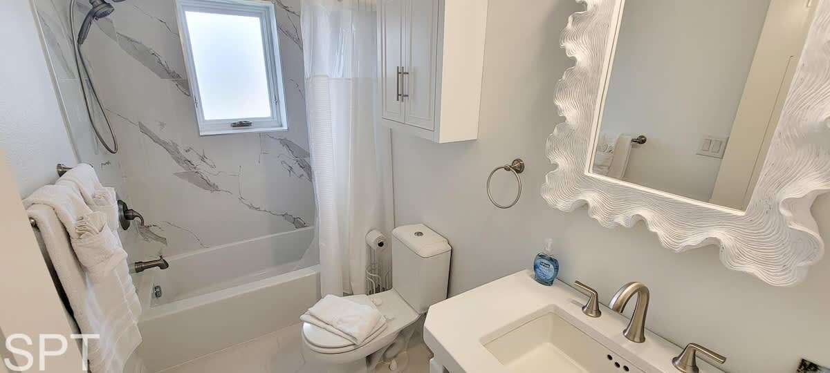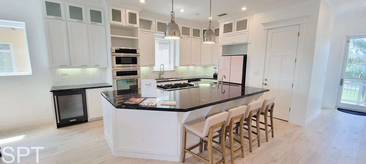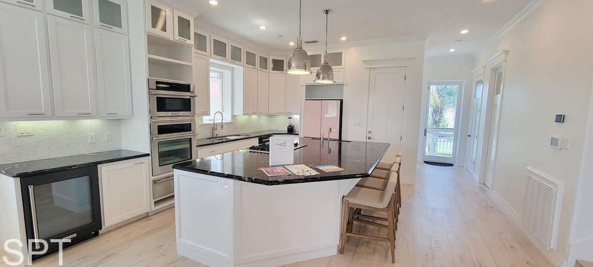 spared. When you think of what a beach rental should look like in a movie, this likely qualifies as that dream. Breathtaking white quartz waterfall counters, wine fridge, massive