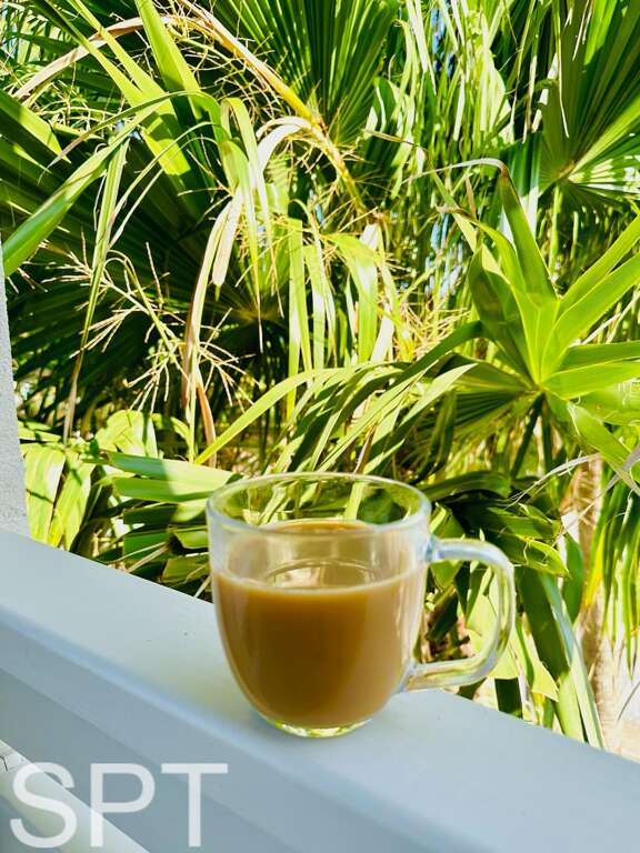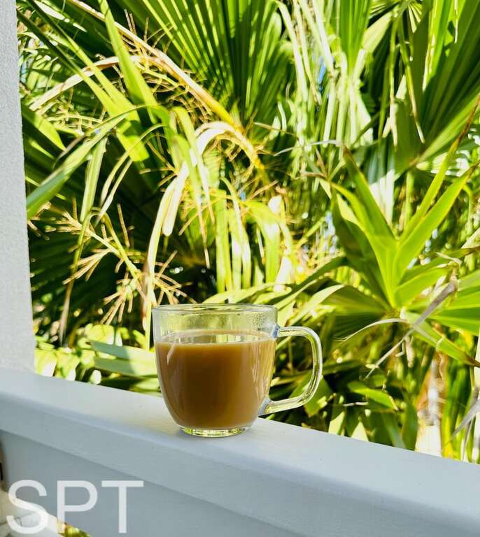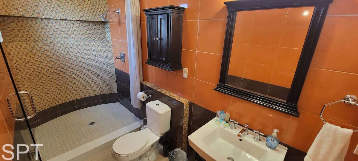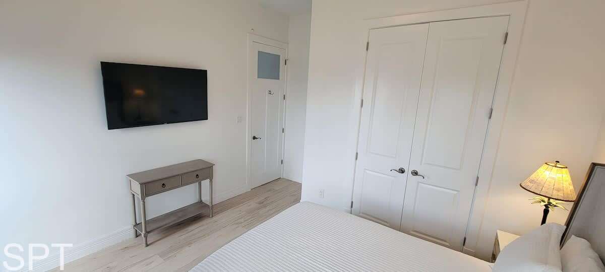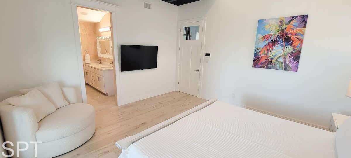The Palm Room is the Master bedroom has a king bed and a provided air mattress – sleeps four with en-suite bathroom and a 55†smart Tv and 30’ private balcony. -