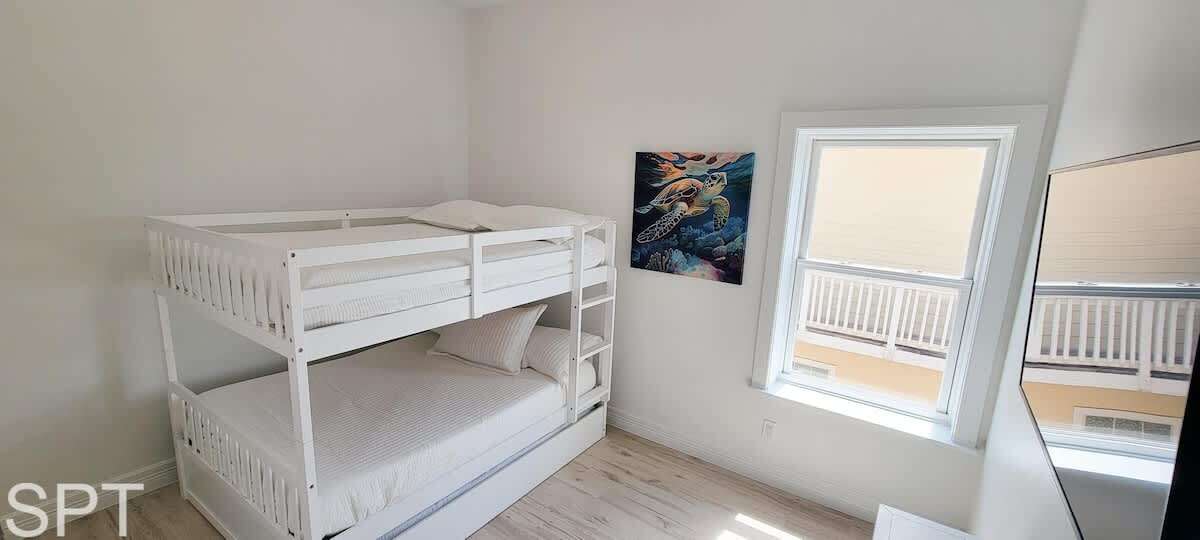 The Seahorse Room is a full over full bunk with a twin trundle, and a balcony overlooking the pool and a smart TV. Sleeps 5 -