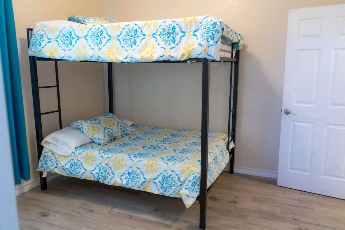 * There is sleeping space for 8 people shoulder to shoulder. I recommend considering bringing a queen sized airbed if more than 6 adults . I do have extra bedding in closet though you may want to bring more. I have all tempurpedic beds. If you haven’t slept on one, you are in for a real treat! There is a california king in master, FULL sized adult bunk beds in 2nd bedroom (both bedrooms have their own full bathroom) and in the living room there is a fold down couch.