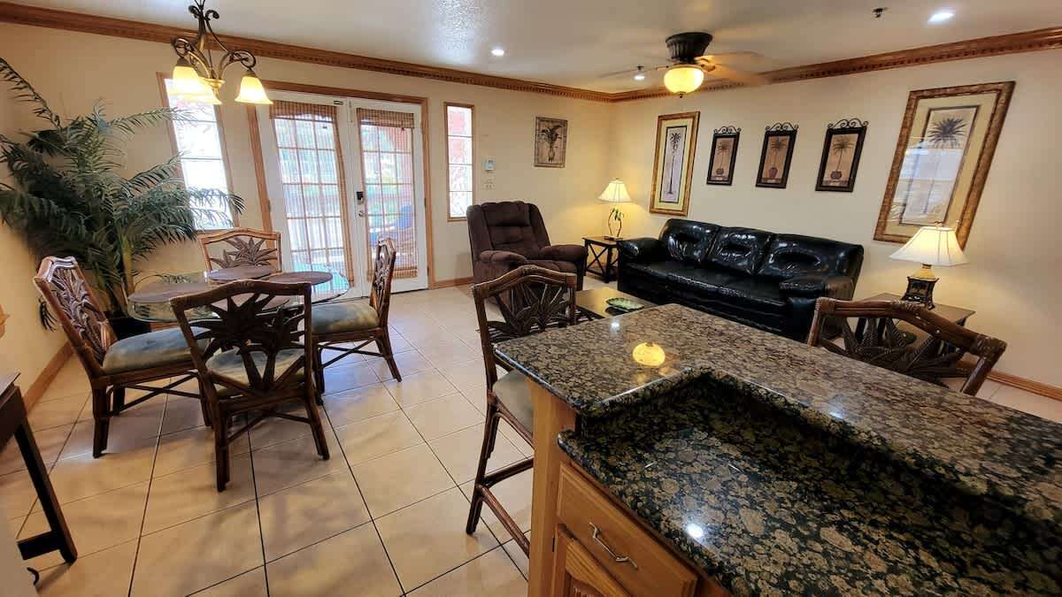 The kitchen has all utensils for eating in, even a blender for those frozen margaritas. As you enter the space, you will notice how open it is.