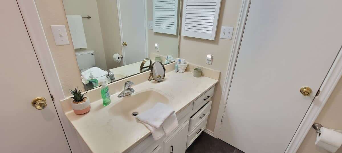 This setup is perfect for a bit more privacy is combining families or generational travel. This home has an eclectic beach house vibes. If you are looking for brand new white quartz cookie cutter, this isn’t your spot to consider as it has personality.
