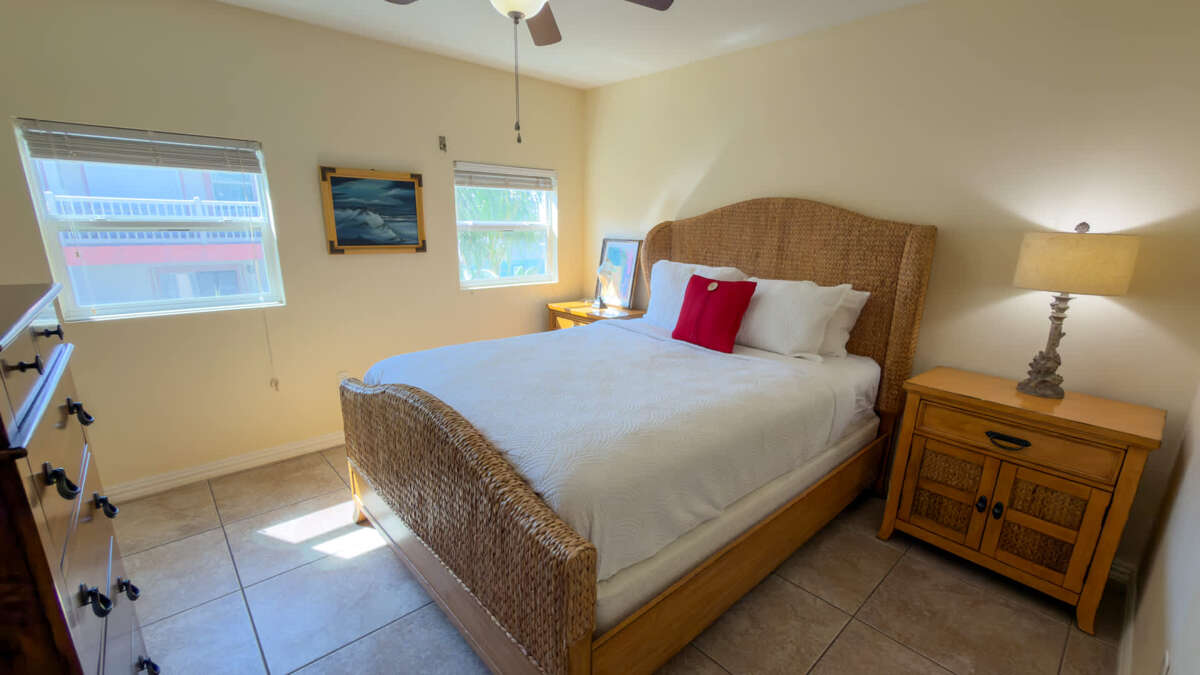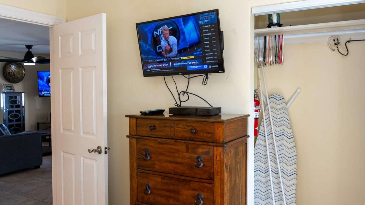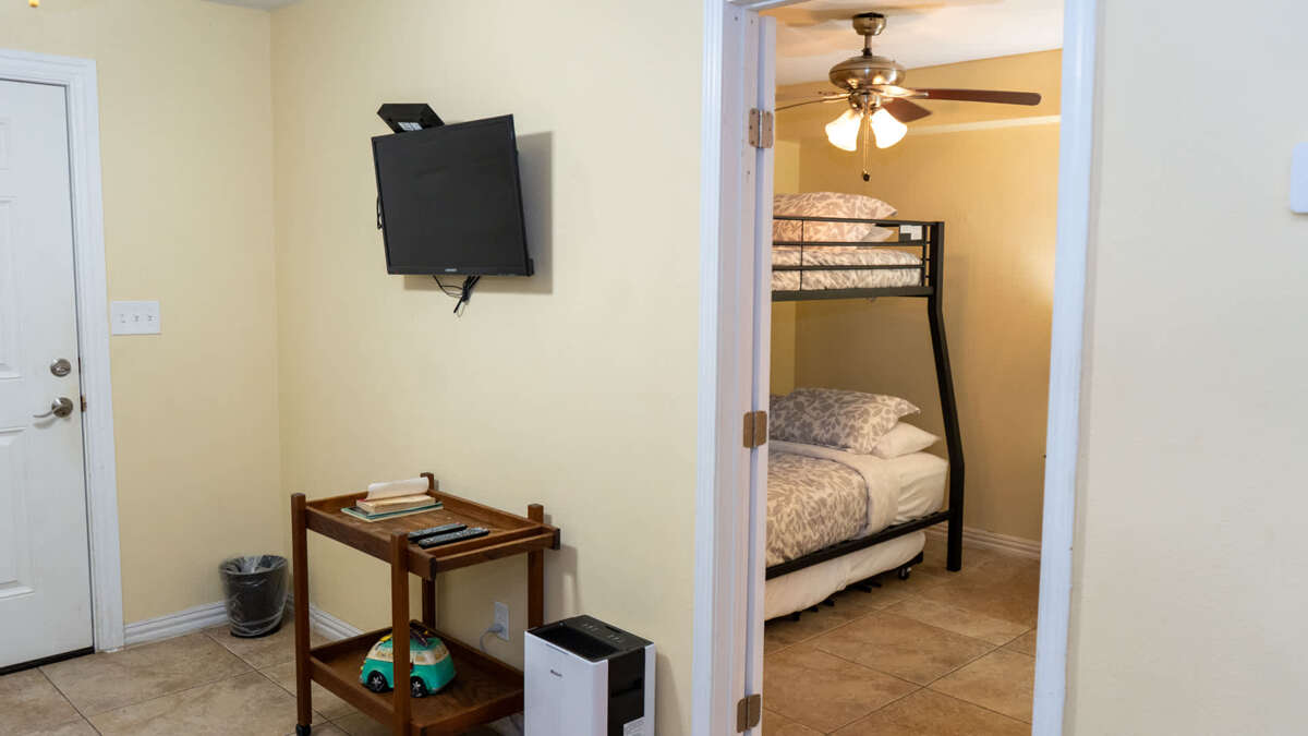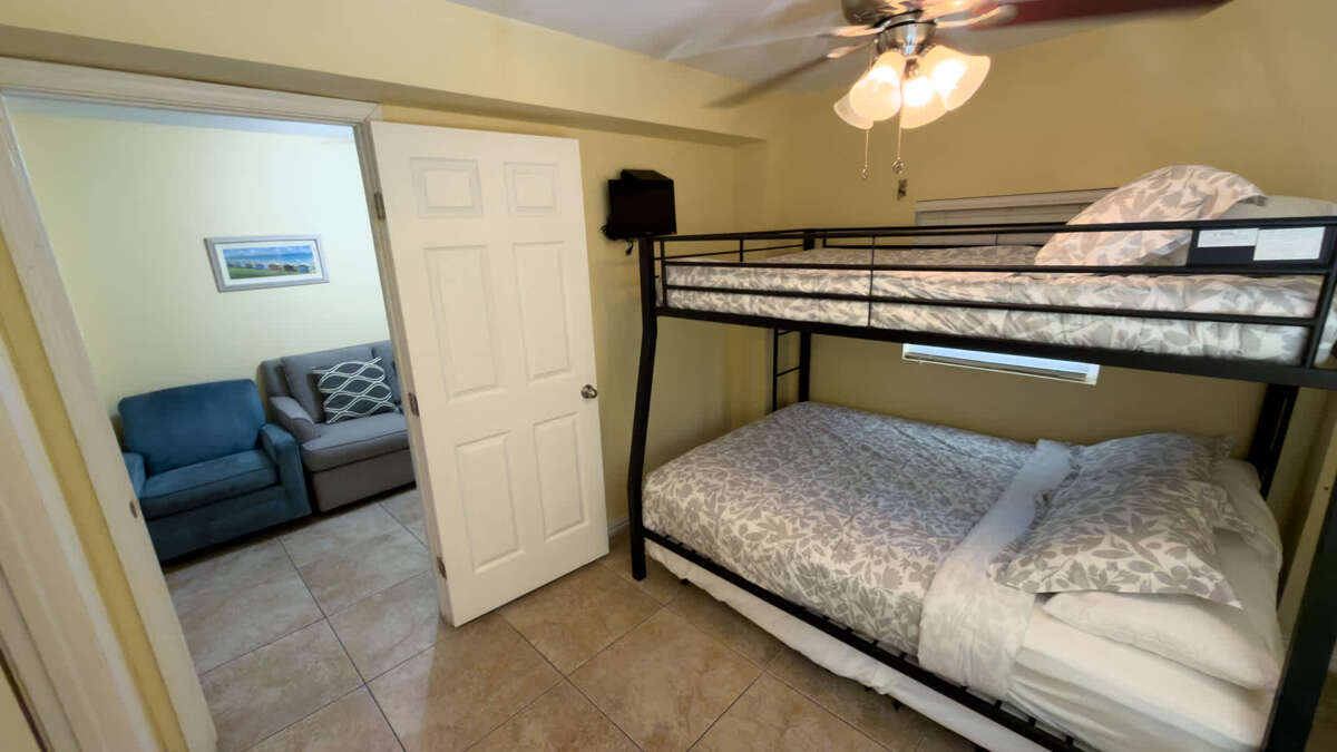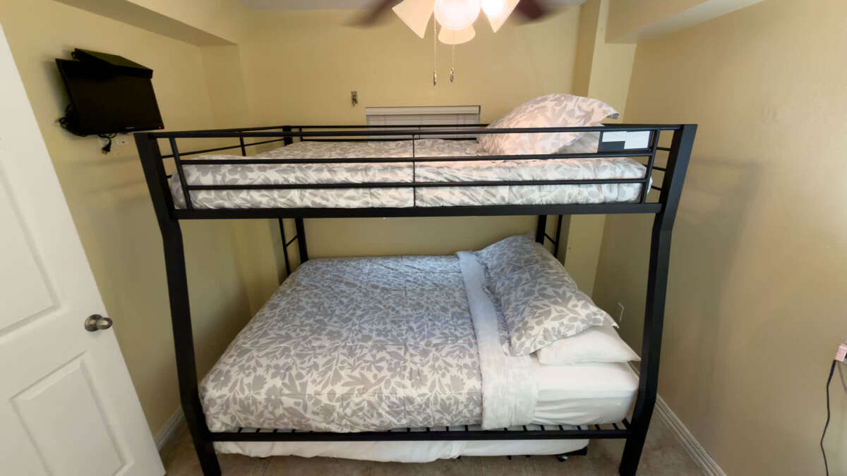 Upstairs, both bedrooms feature one Queen size bed and flat screen TV. As of May 15th, one queen bed in one of the upstairs bedrooms will be removed and an adult sized bunk bed installed brand new with 2 full sized beds.