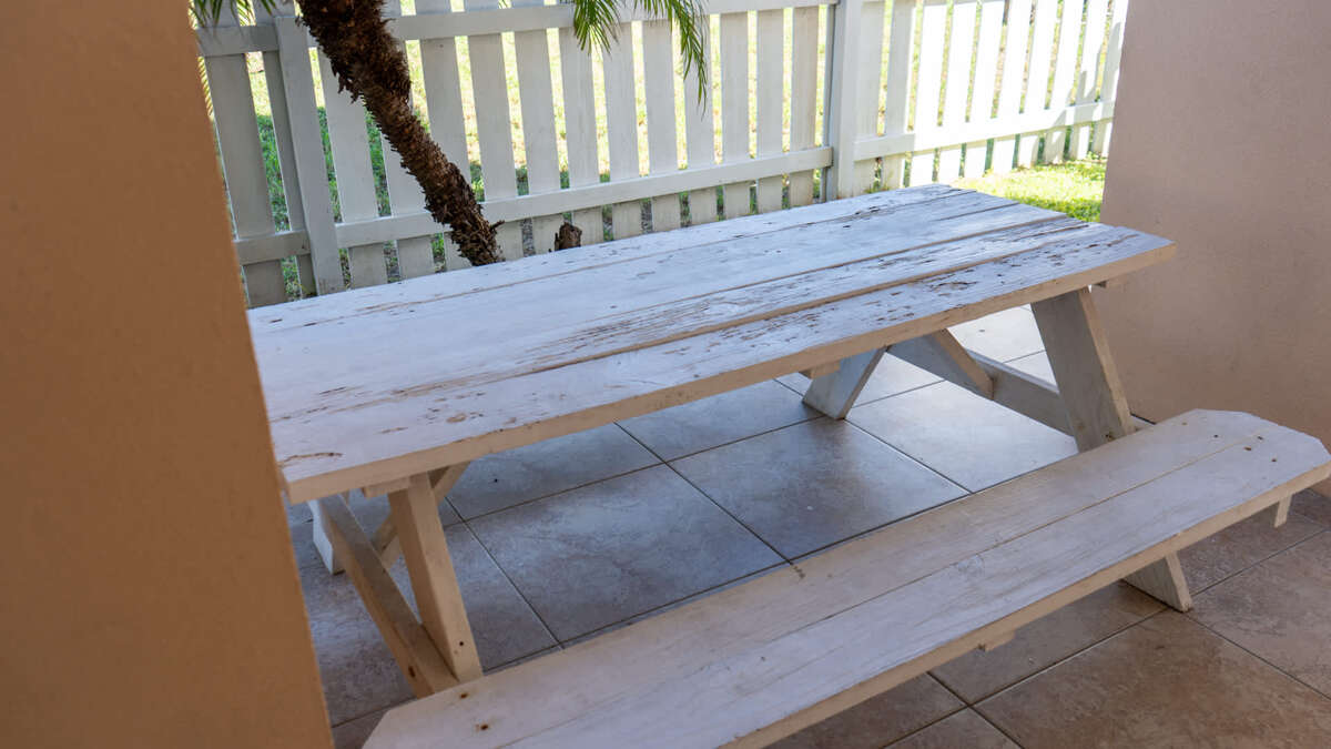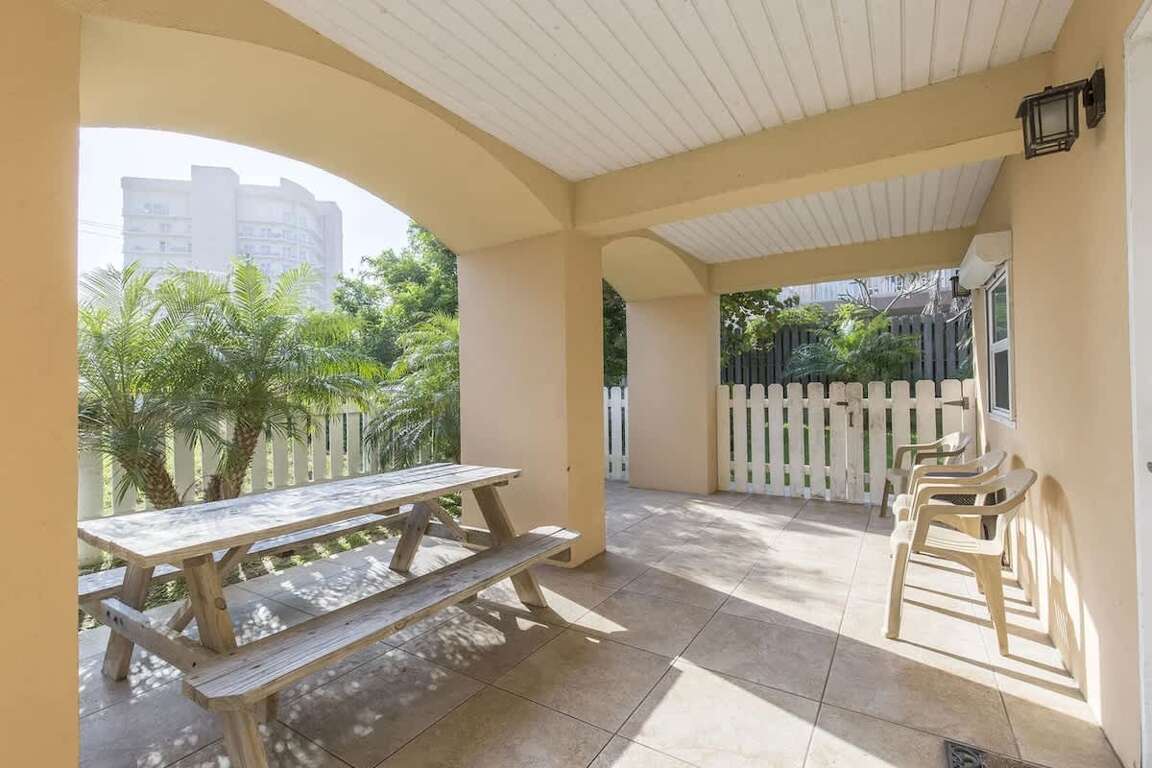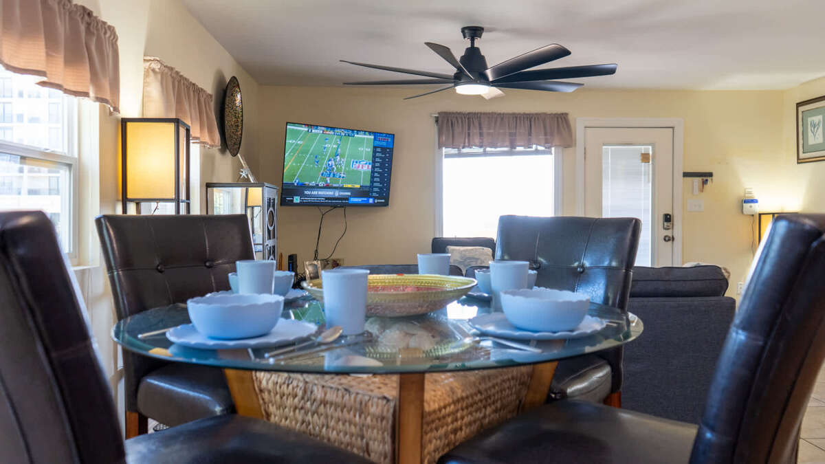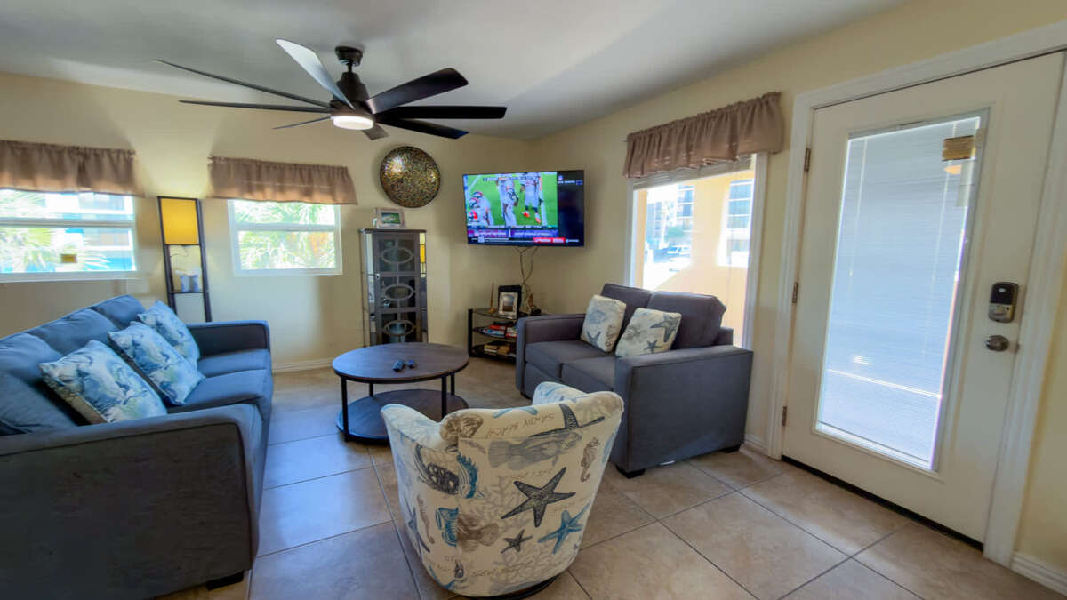 Your living room features a flat screen SMART TV and opens up to a large patio with outdoor dining table overlooking a bright green yard and partial oceanview and beach view.